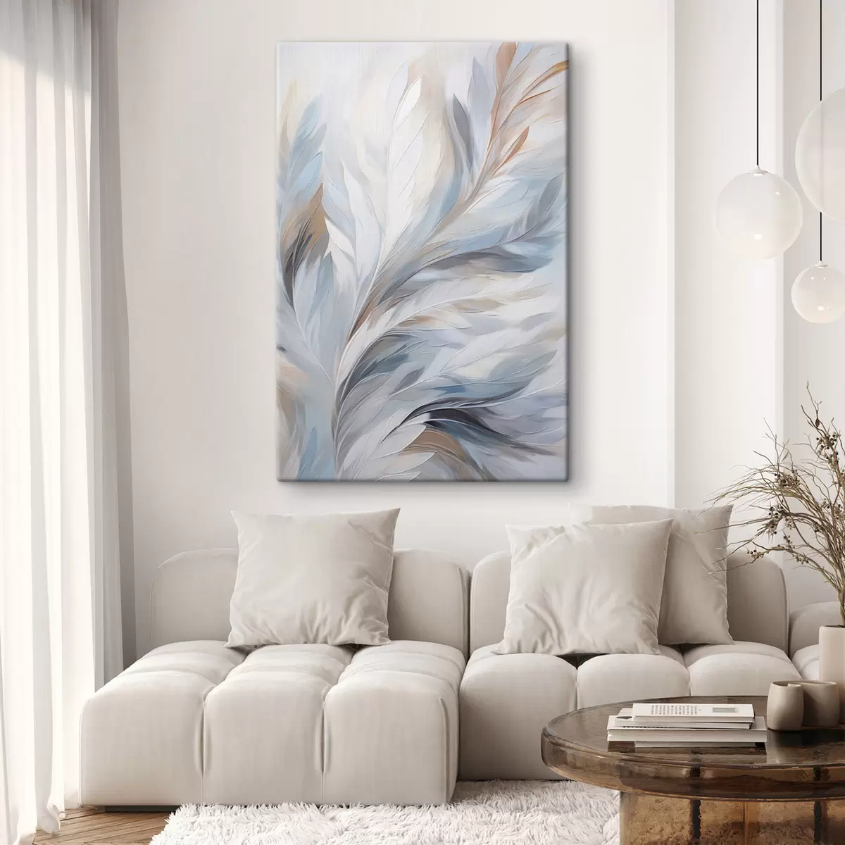 Tableau Plumes délicates bleu clair et marron à la texture douce et éthérée, sur fond blanc. Nr s47416