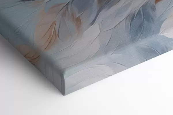 Tableau Peinture abstraite représentant des plumes dans des tons blancs, bleus et bruns, avec une texture douce et fluide et un fond clair. Nr s47417