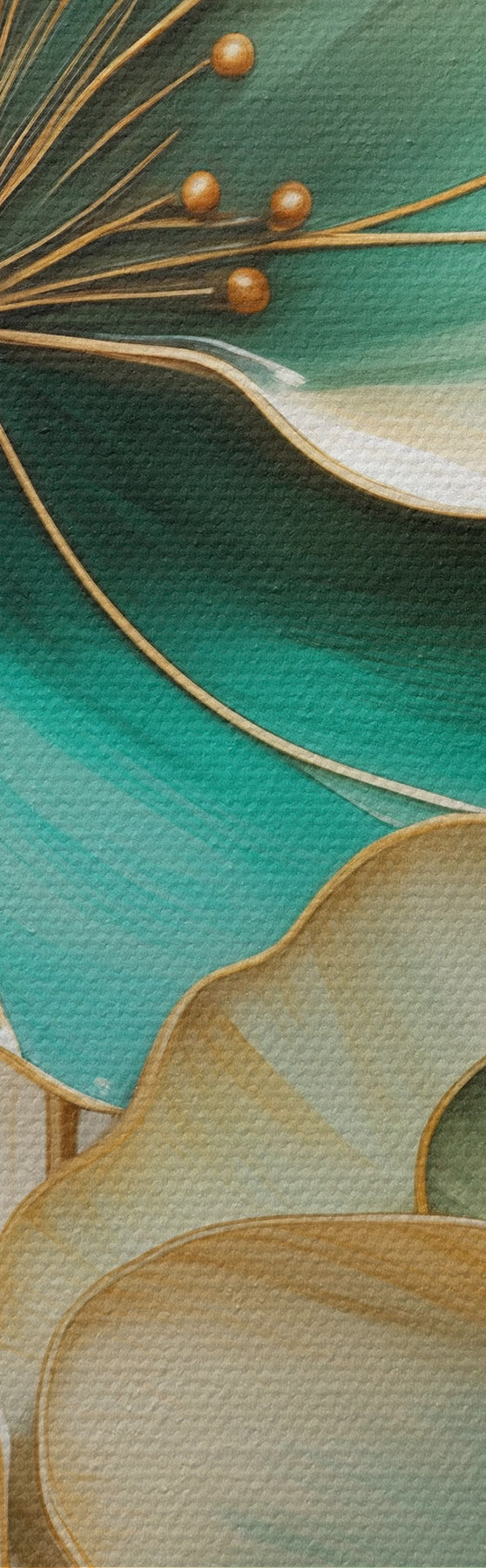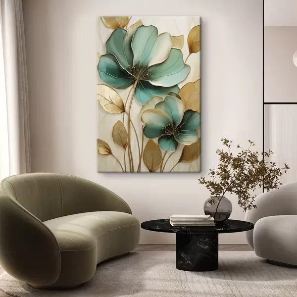 Tableau Grandes fleurs bleu sarcelle et jaunes avec contours, entourées de feuilles jaunes sur fond abstrait Nr s47418