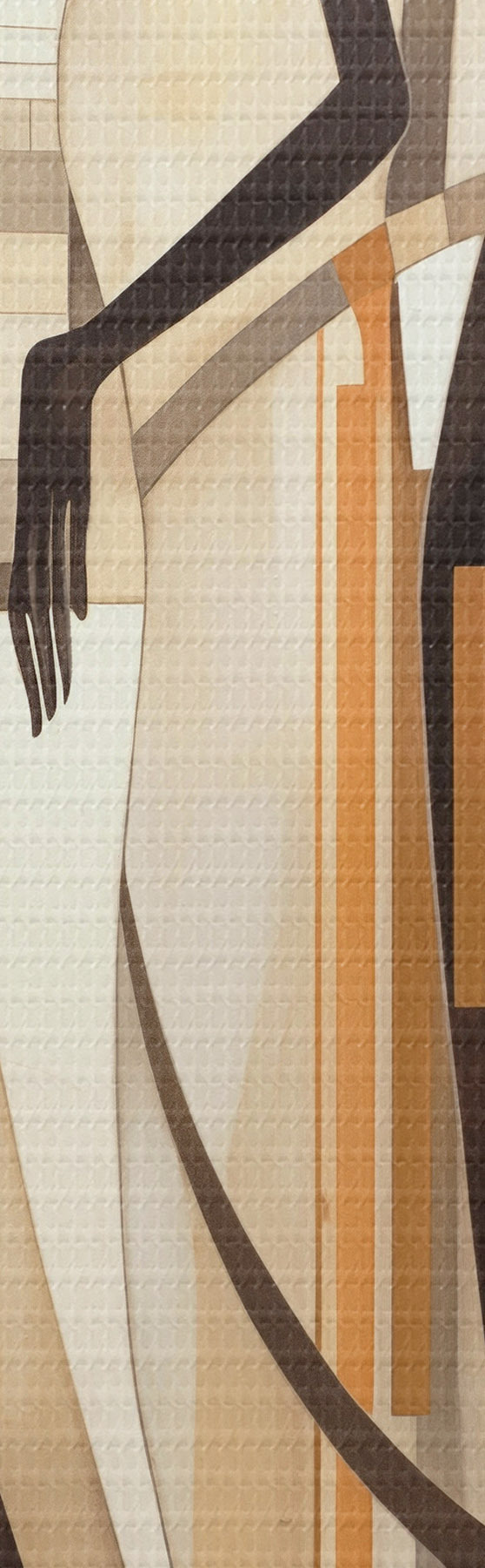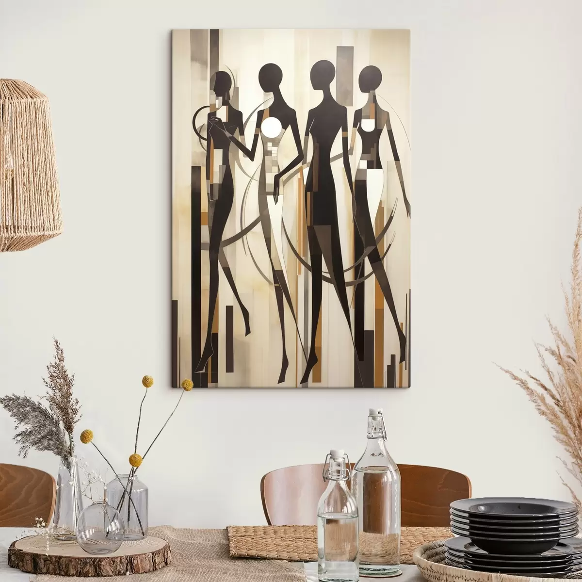 Tableau Figures féminines stylisées avec des éléments géométriques sur un fond abstrait de lignes verticales Nr s47423