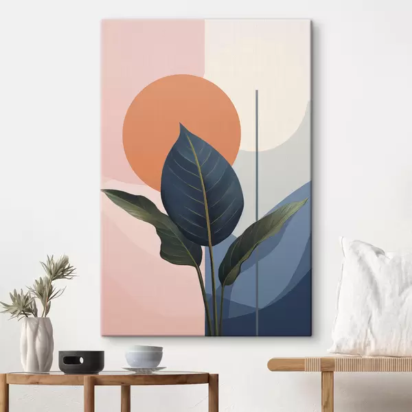 Tableau Feuilles sombres sur fond de formes abstraites dans les tons pêche et gris avec un cercle orange Nr s47425