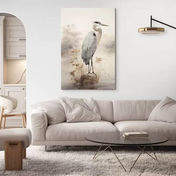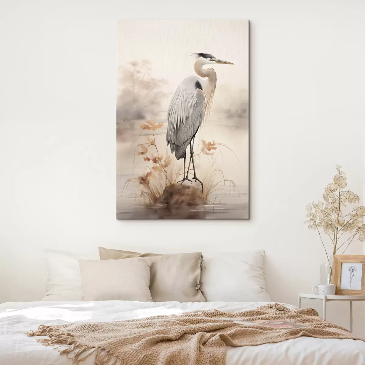 Tableau Un héron se tient sur un rocher dans un lac, avec de hautes herbes et des arbres en arrière-plan. s47426