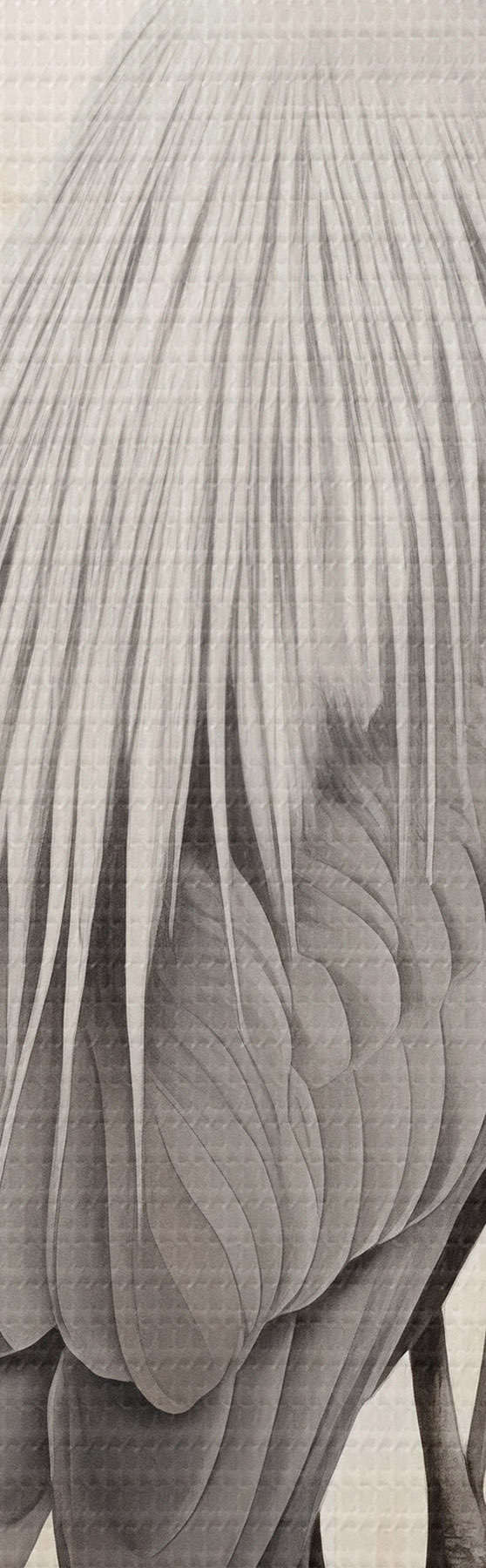 Tableau Un héron se tient sur un rocher dans un lac, avec de hautes herbes et des arbres en arrière-plan. Nr s47426