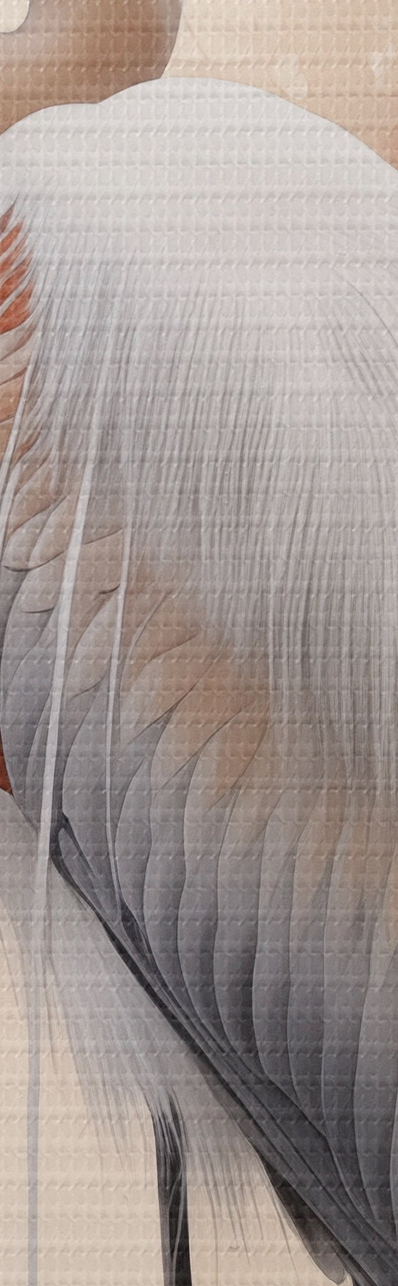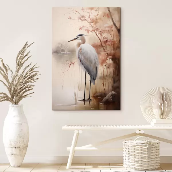 Tableau Un héron se tient sur un rocher dans un lac, avec de hautes herbes et des arbres en arrière-plan. s47427