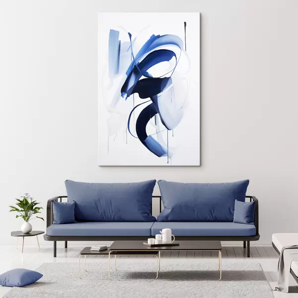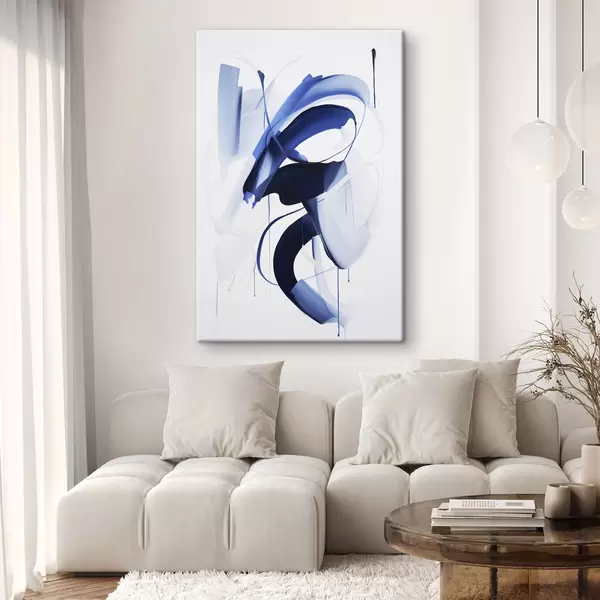 Tableau Formes abstraites bleues ressemblant à des coups de pinceau, avec des lignes et des courbes fluides sur fond blanc, art moderne. s47428