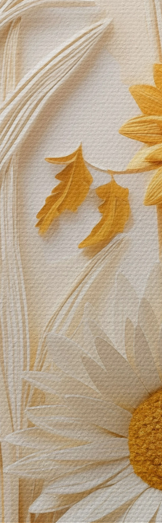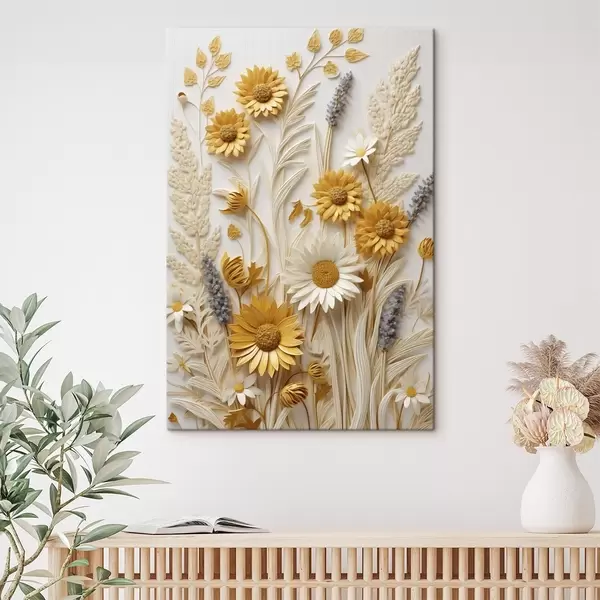 Tableau Une collection texturée de marguerites jaunes et blanches avec des herbes séchées et des brins de lavande sur fond blanc. s47430