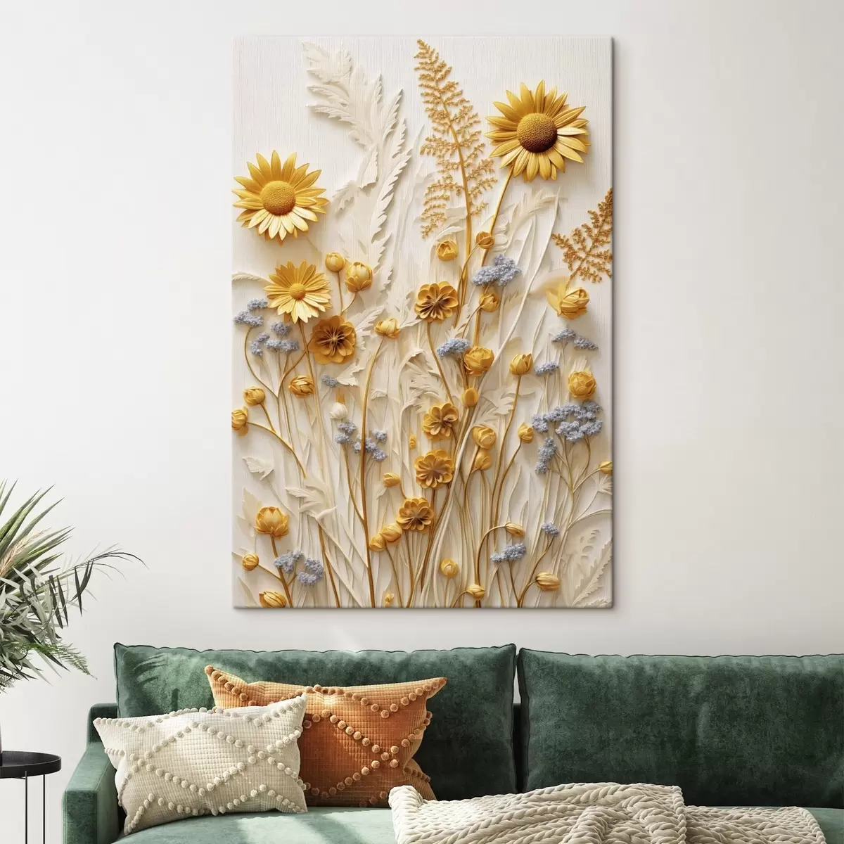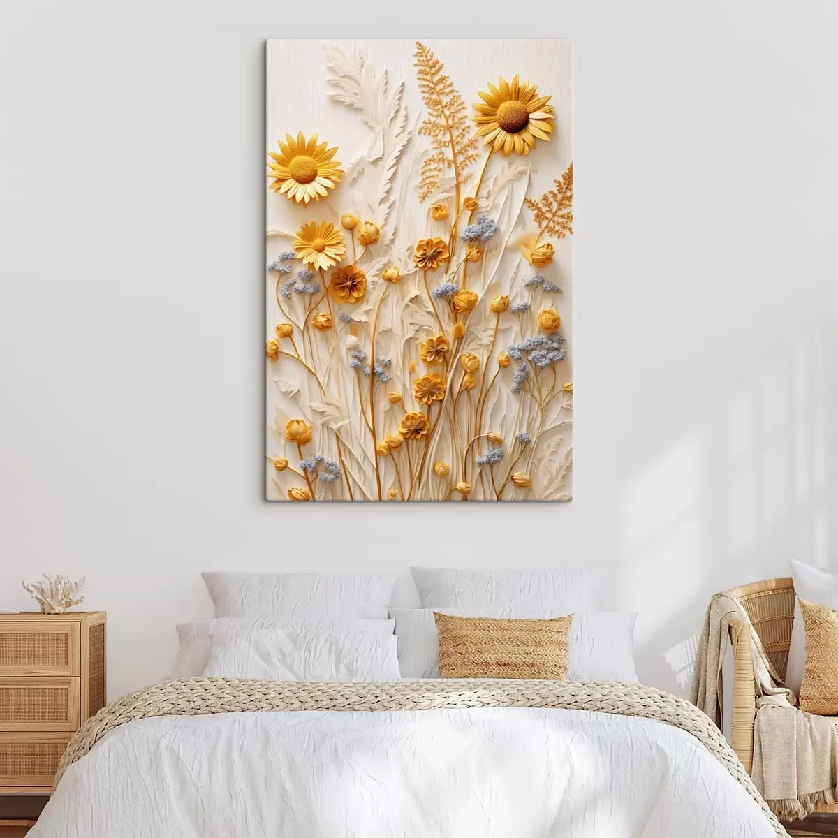 Tableau Une collection texturée de marguerites jaunes et blanches avec des herbes séchées et des brins de lavande sur fond blanc. s47431