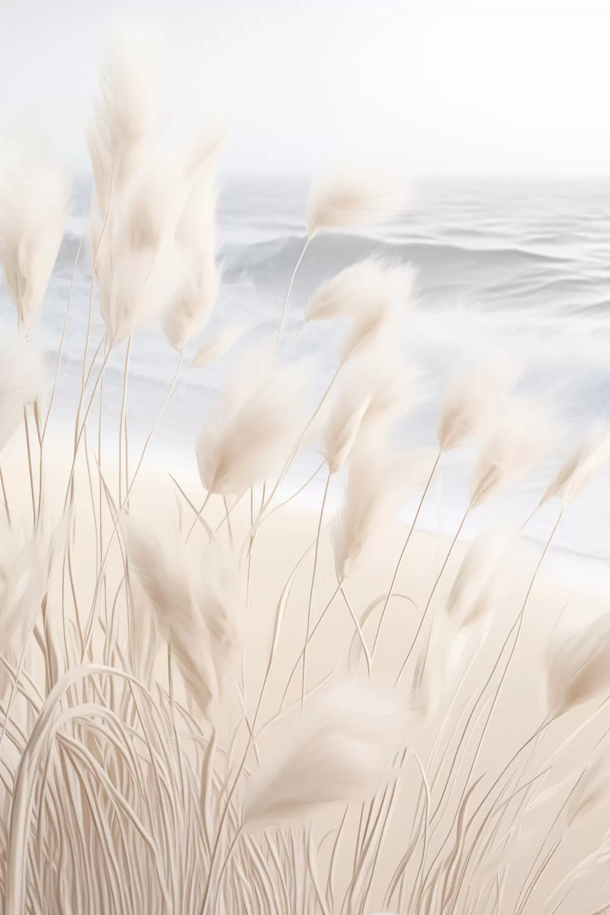 Tableau Haute herbe de pampa plumeuse dans des tons beiges doux au premier plan, avec une plage de sable en arrière-plan. Nr s47432