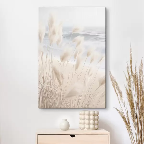 Tableau Haute herbe de pampa plumeuse dans des tons beiges doux au premier plan, avec une plage de sable en arrière-plan. s47432