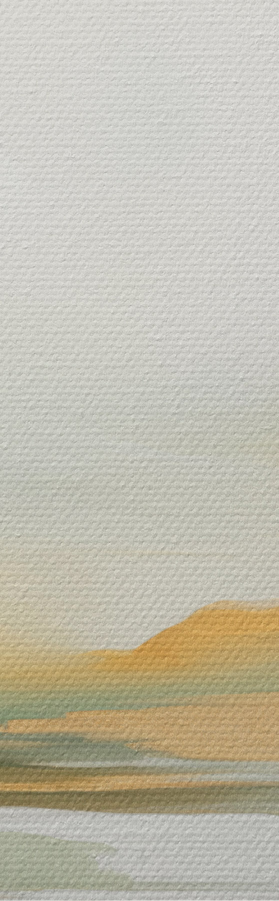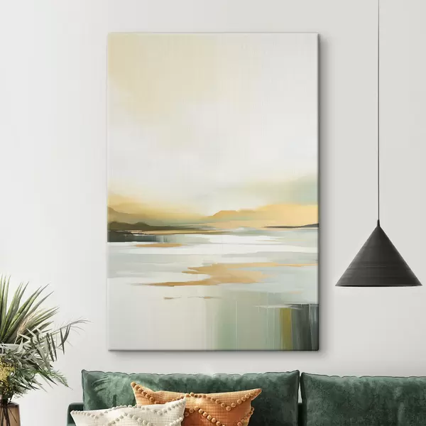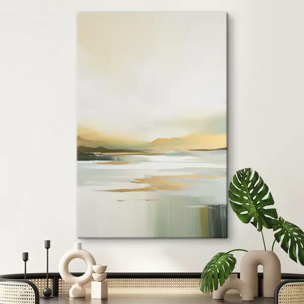 Tableau Paysage abstrait aux tons jaunes et verts, eau reflétant le ciel et les montagnes lointaines, ciel pâle et brumeux Nr s47439