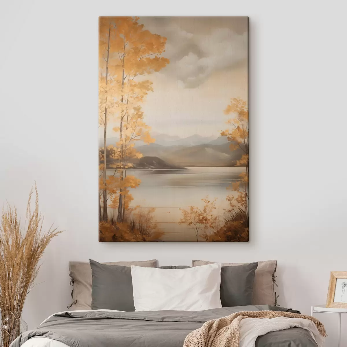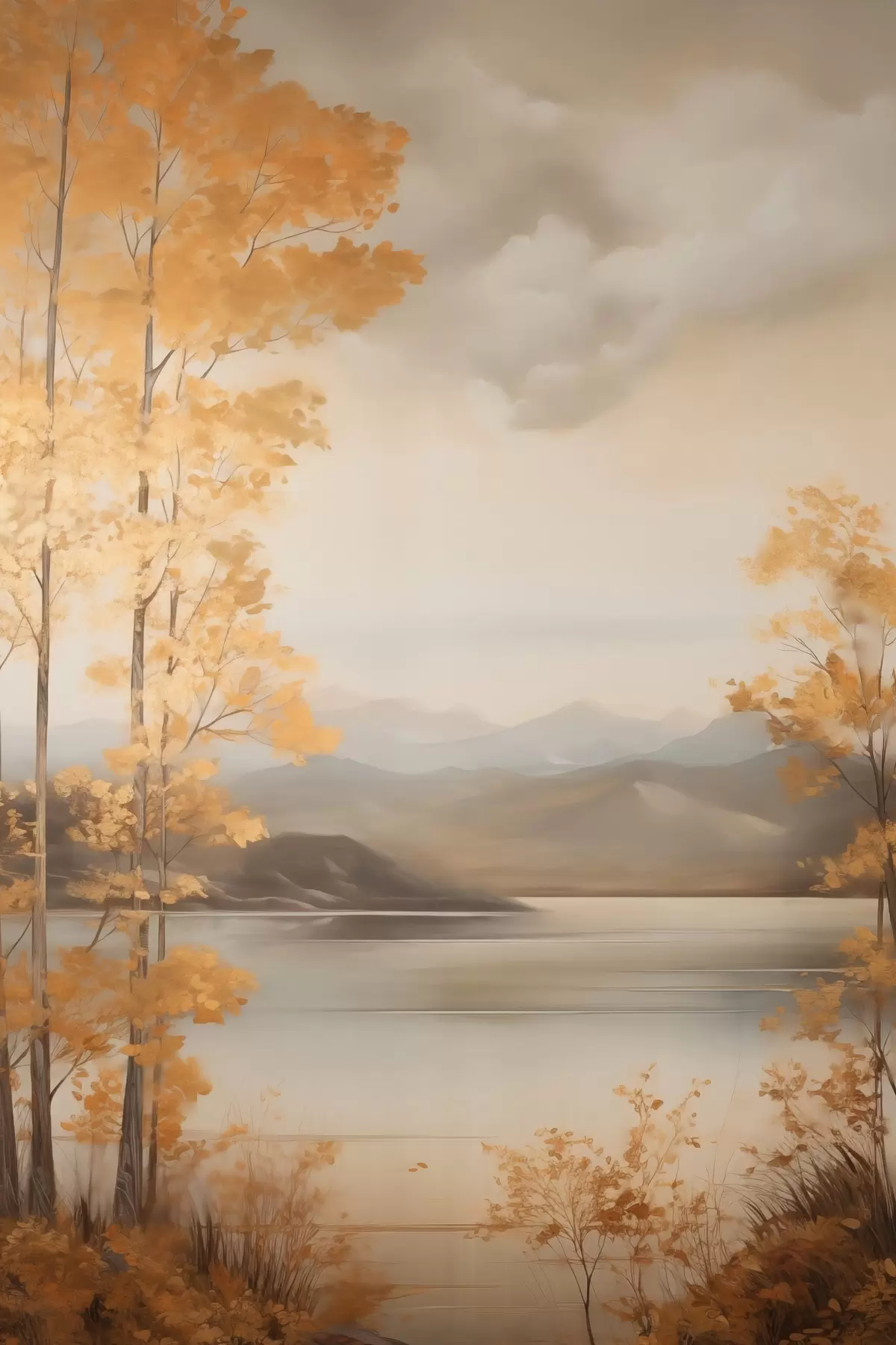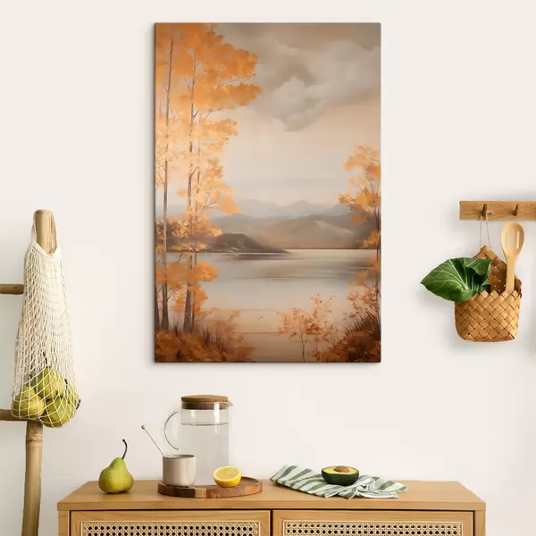 Tableau Des arbres aux feuilles orange, caractéristiques de l'automne, encadrent un lac paisible avec des montagnes lointaines sous un ciel nuageux. s47441