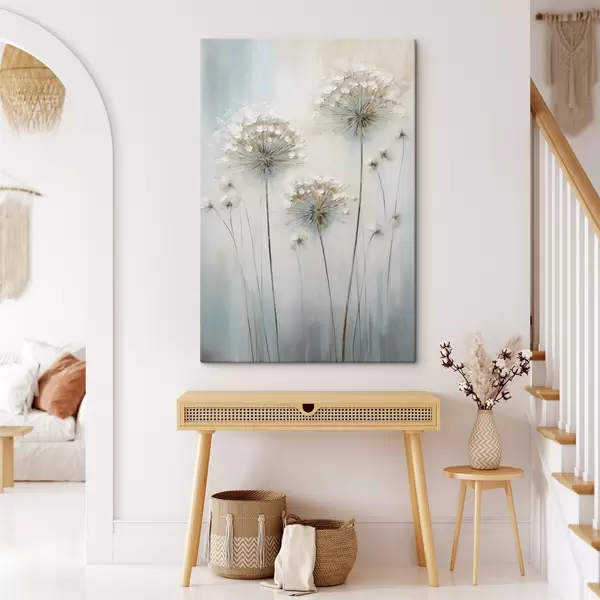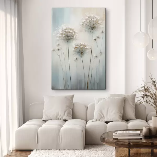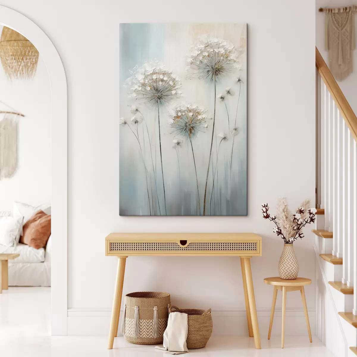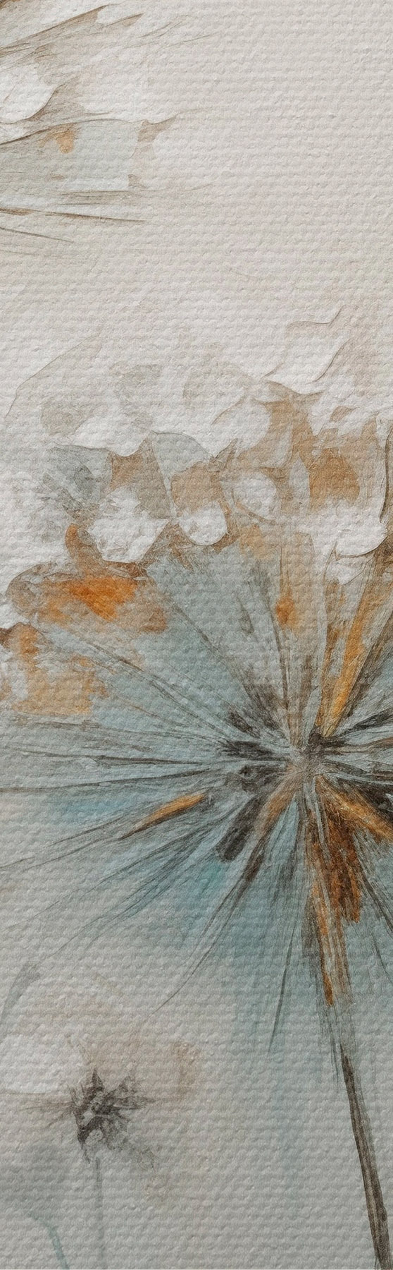 Tableau Style pictural texturé représentant des pissenlits sur un fond bleu et blanc doux Nr s47855