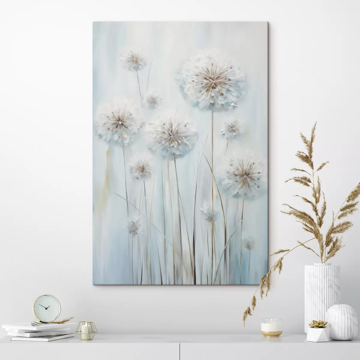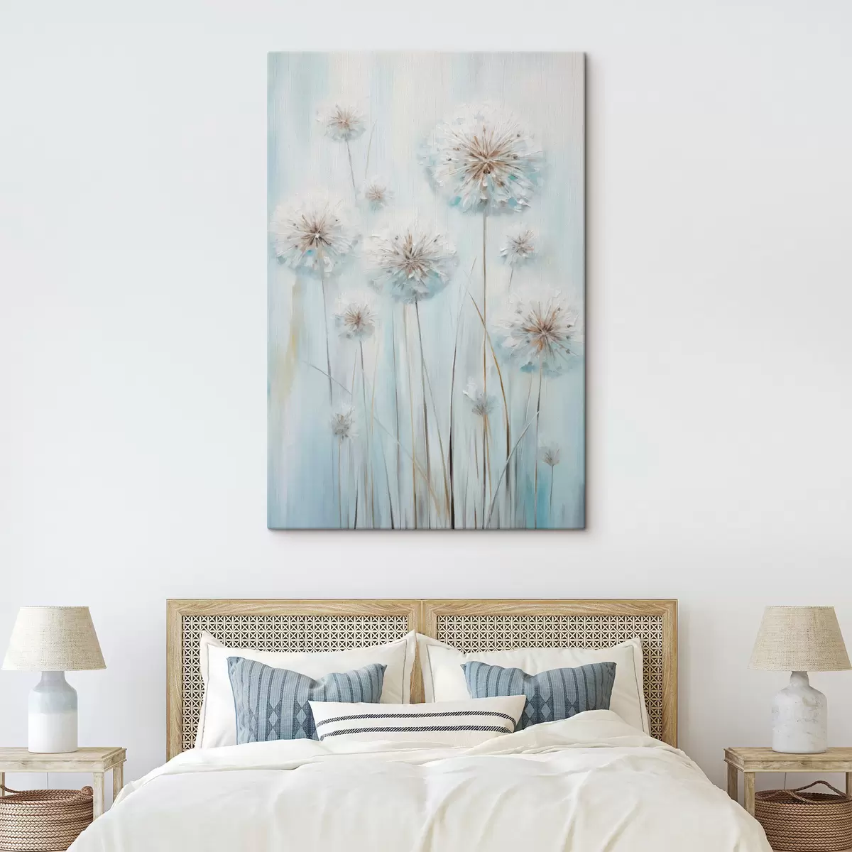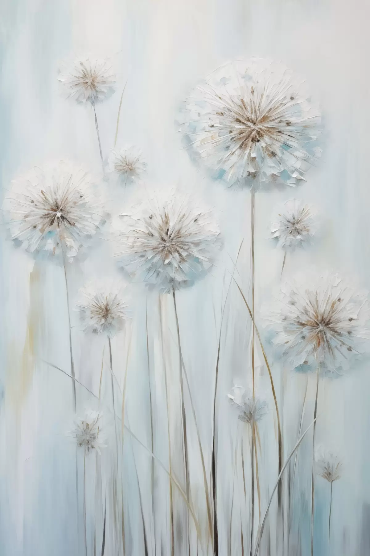Tableau Style pictural texturé représentant des pissenlits sur un fond bleu et blanc doux Nr s47856