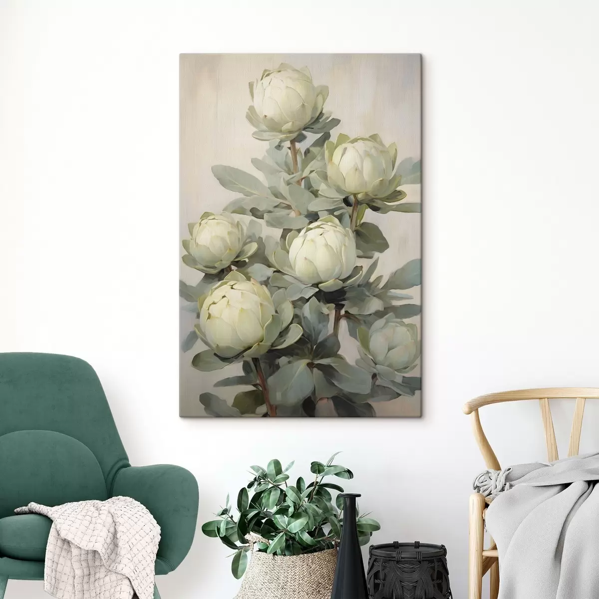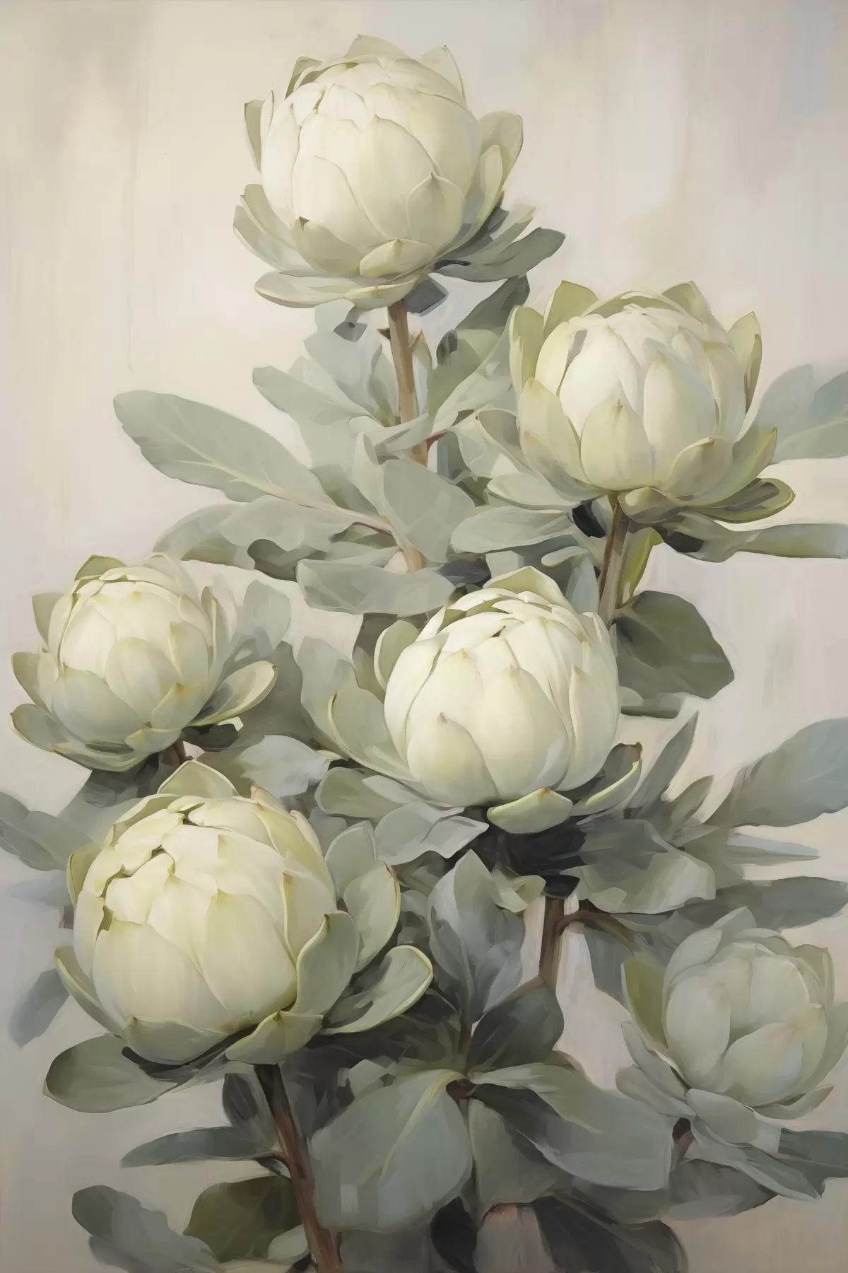 Tableau Style pictural représentant plusieurs fleurs de protéa blanches avec de grandes feuilles vertes sur un fond clair. Nr s47861