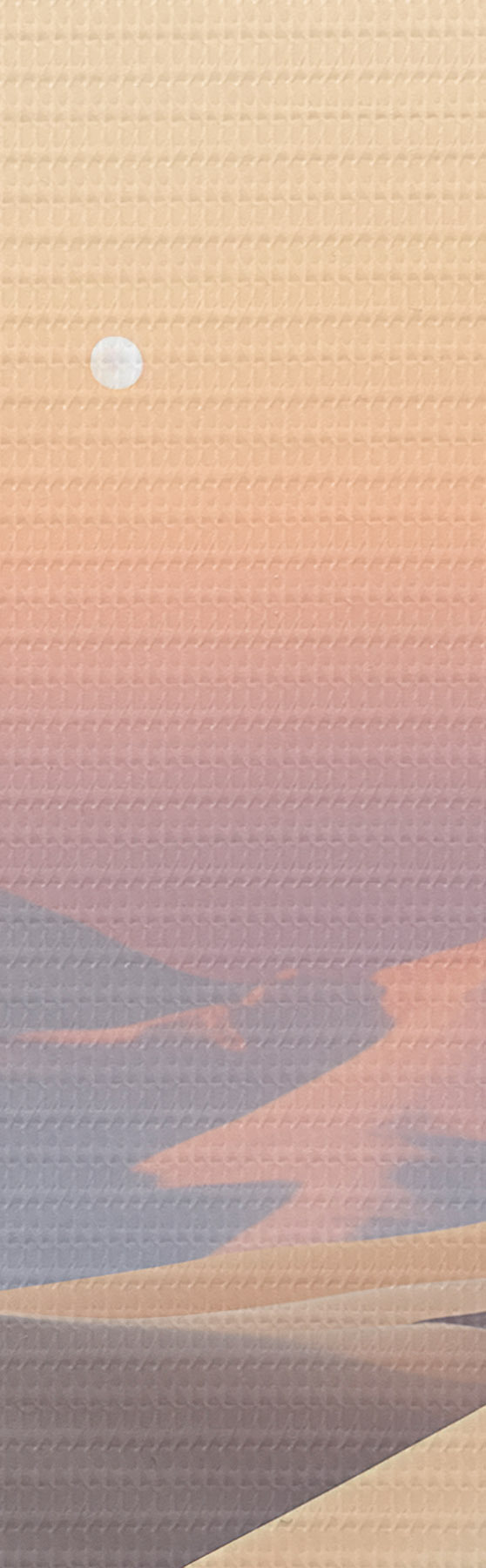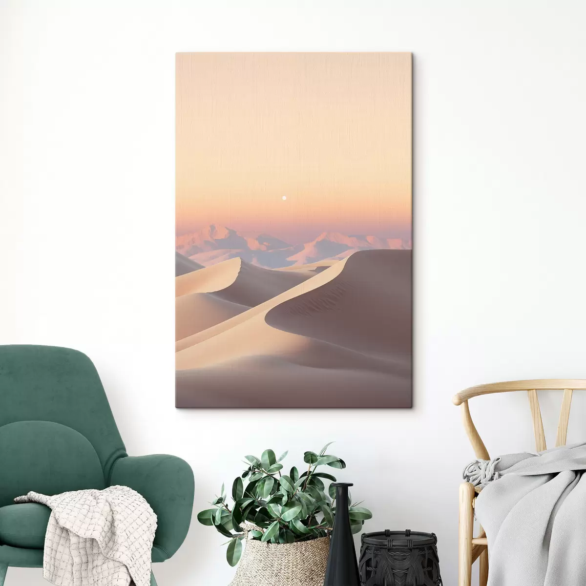 Tableau Un paysage désertique avec des dunes de sable ondulantes sous un ciel pastel doux, des montagnes lointaines en arrière-plan. Nr s47865