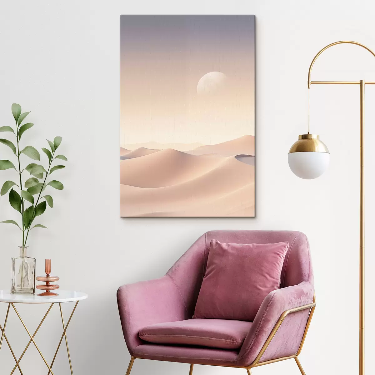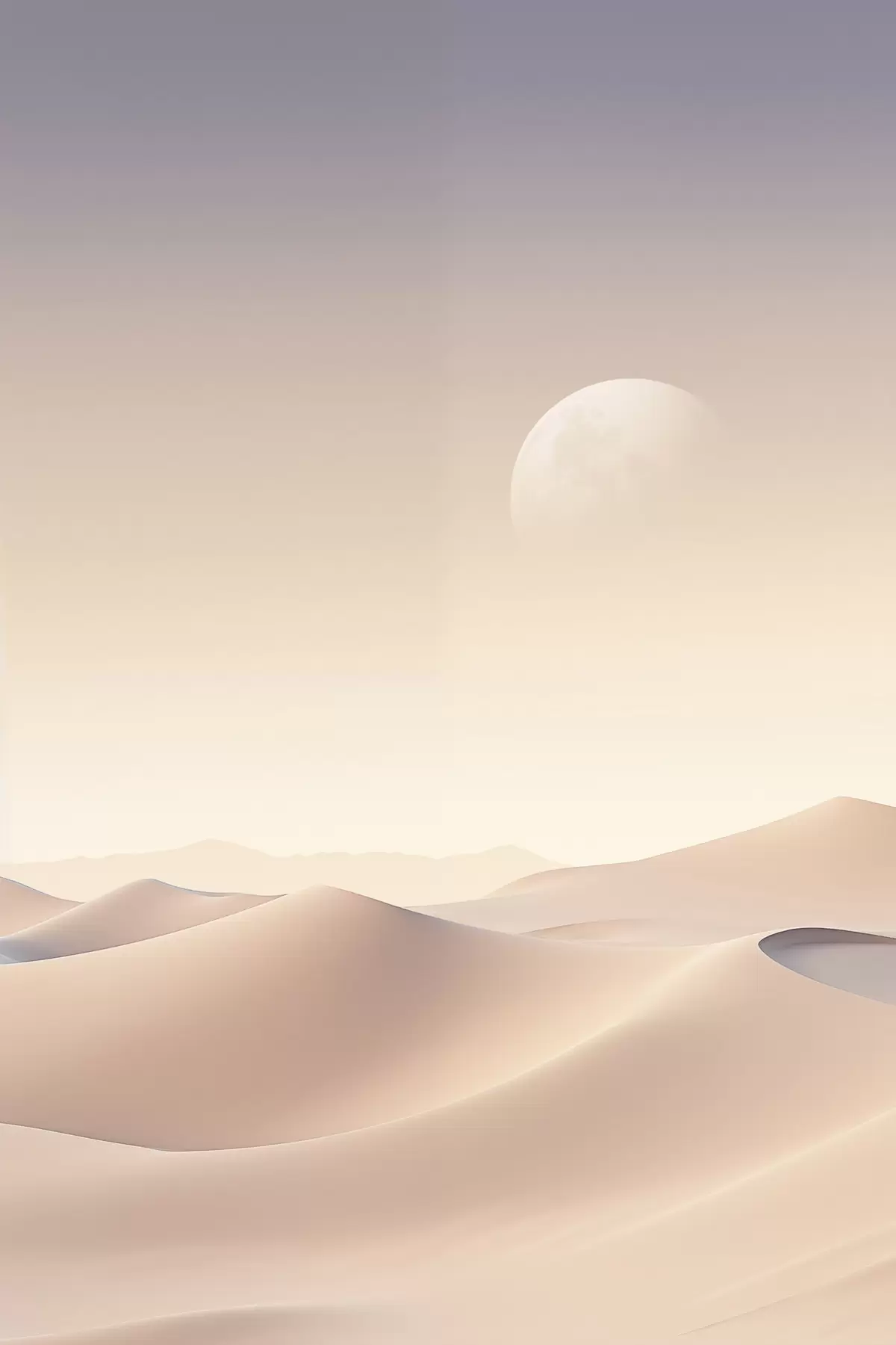 Tableau Un paysage désertique avec des dunes de sable ondulantes sous un ciel pastel doux, des montagnes lointaines en arrière-plan. Nr s47866