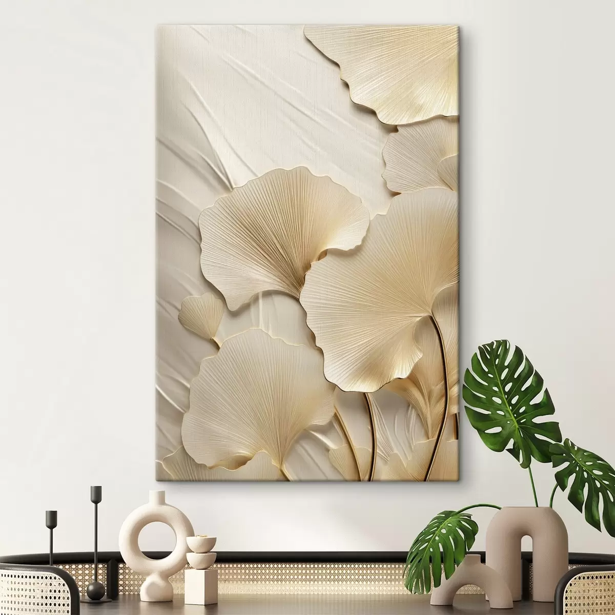 Tableau Feuilles de ginkgo abstraites sur fond clair texturé, composition élégante et abstraite s47867