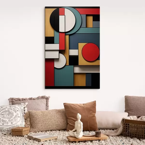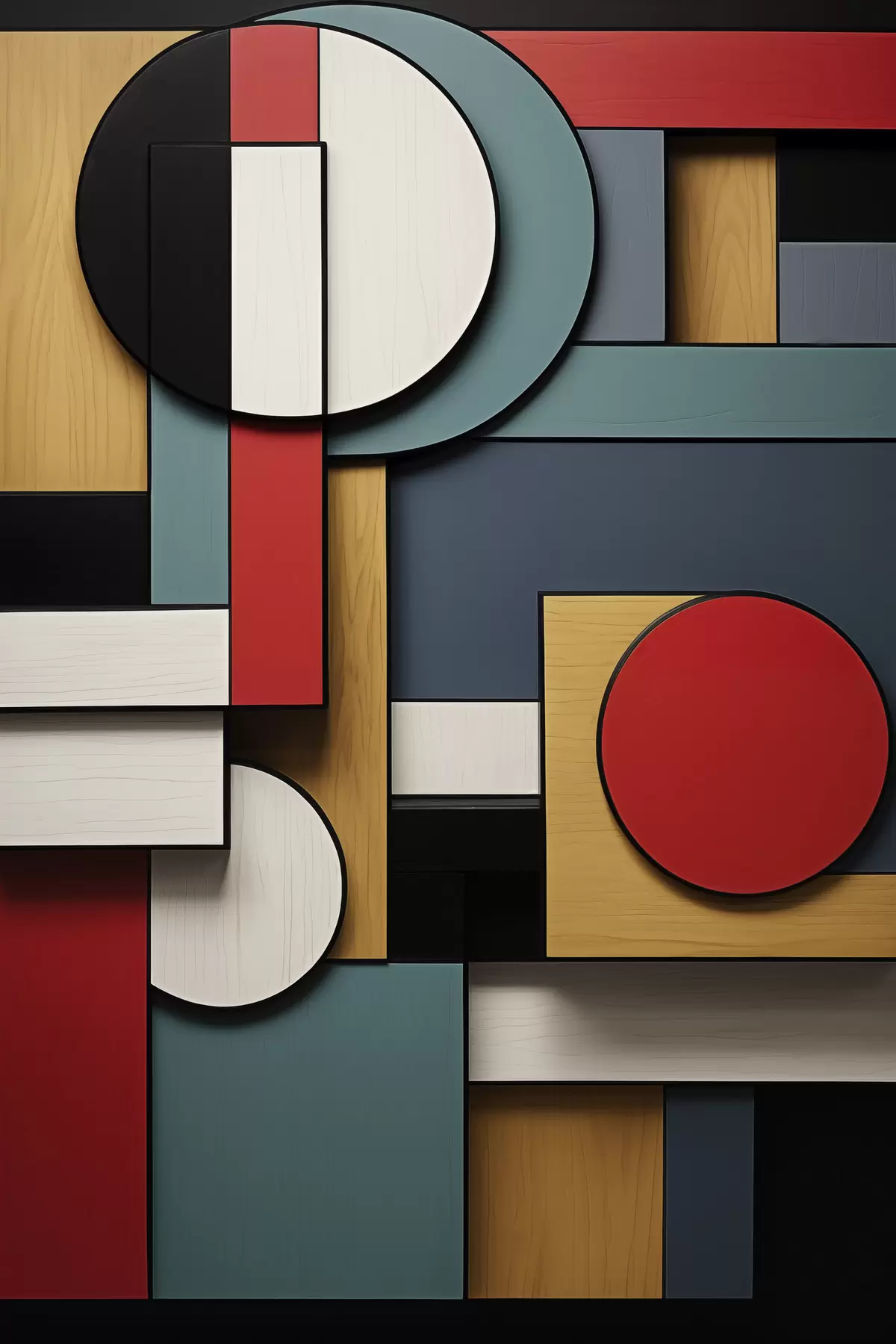 Tableau Composition géométrique abstraite avec imitation de texture bois, rectangles et cercles rouges, noirs, blancs et bleu sarcelle Nr s47875