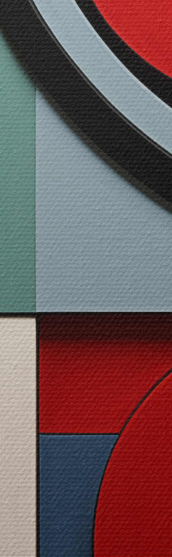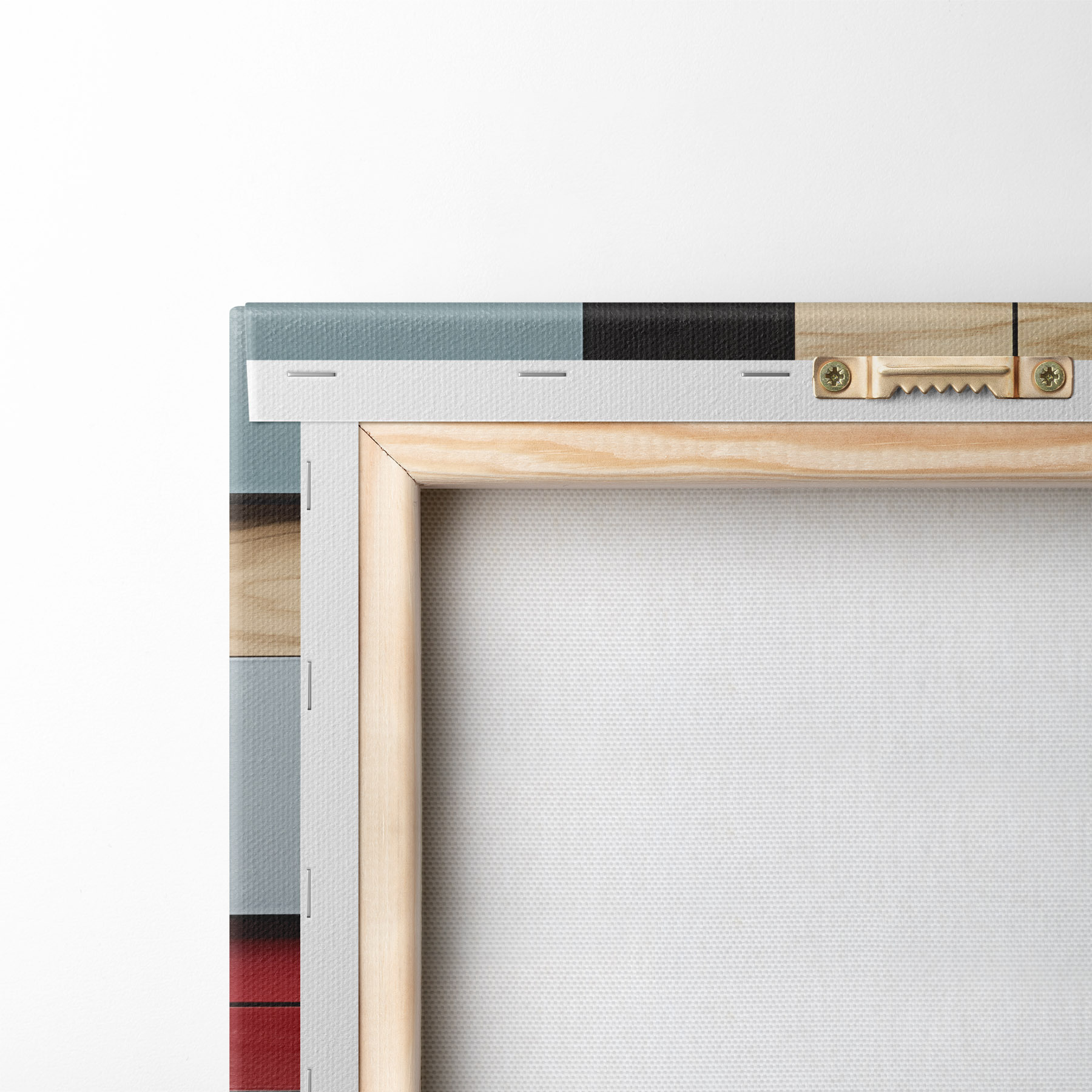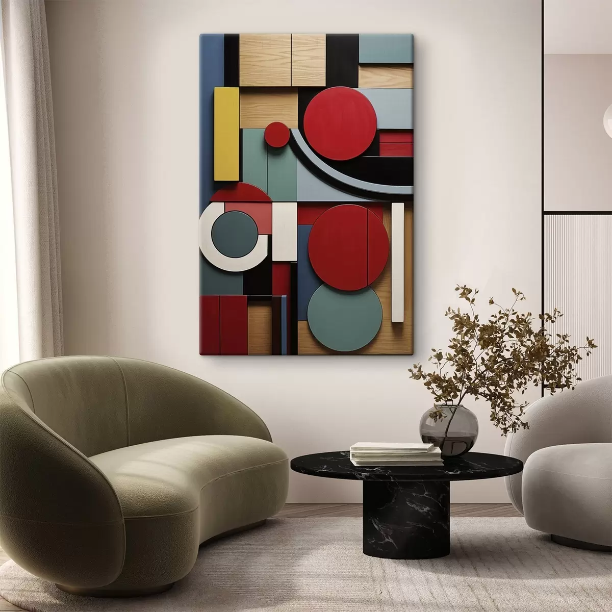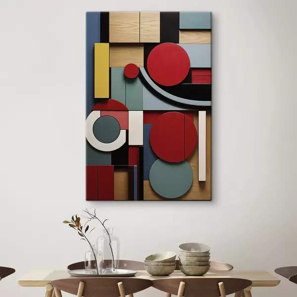 Tableau Composition géométrique abstraite avec imitation de texture bois, rectangles et cercles rouges, noirs, blancs et bleu sarcelle Nr s47876