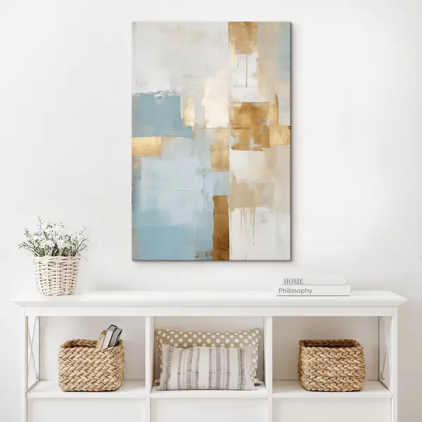 Tableau Formes géométriques abstraites aux couleurs jaune, bleu et blanc, composition texturée et minimaliste Nr s47882