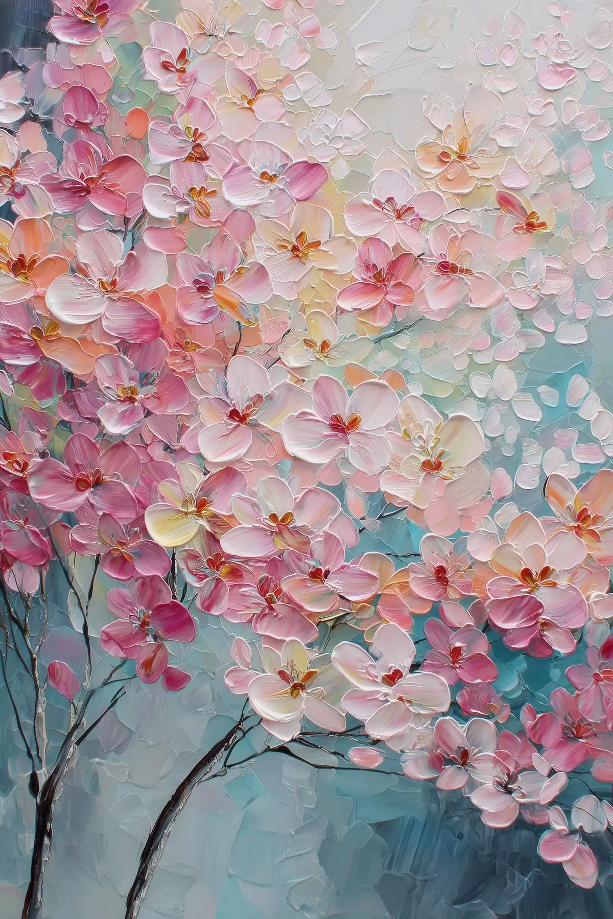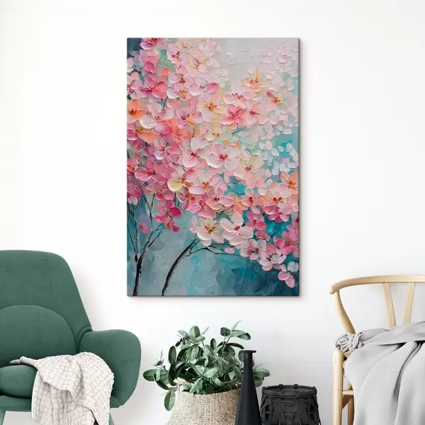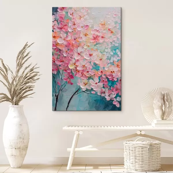 Tableau Branche avec des fleurs roses sur fond bleu dans un style peinture à l'huile s47987