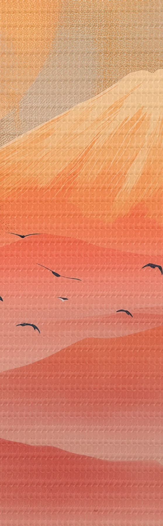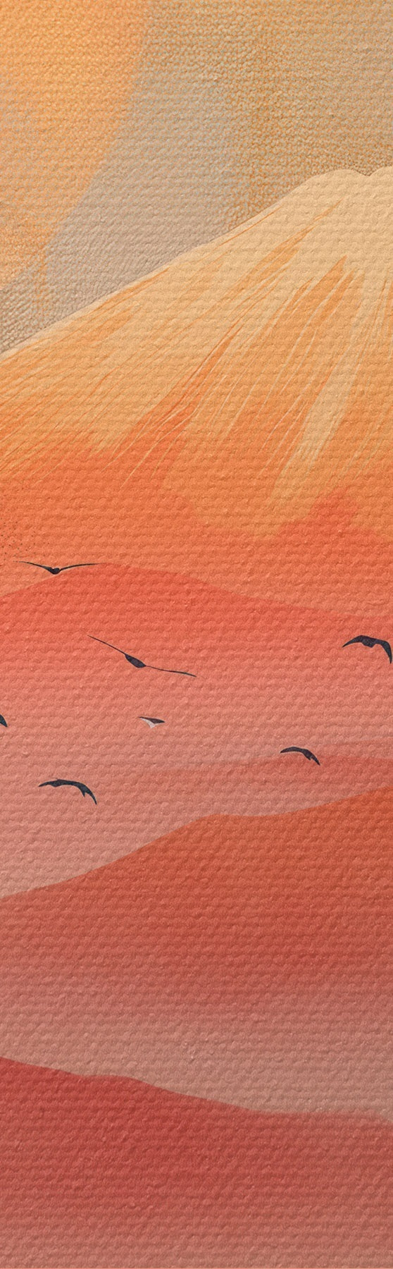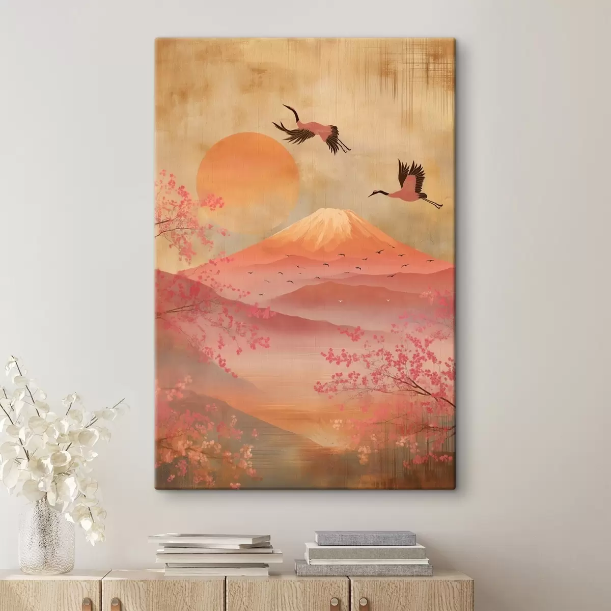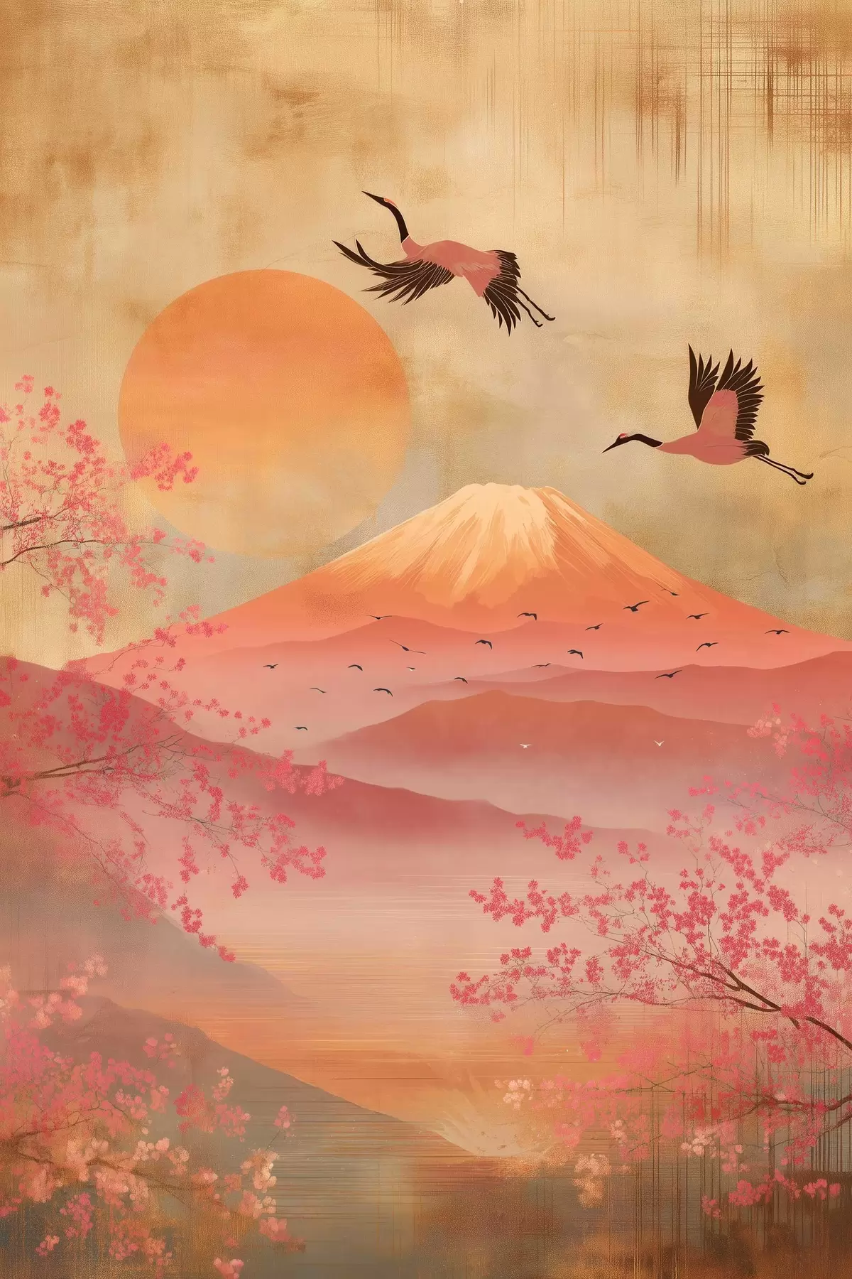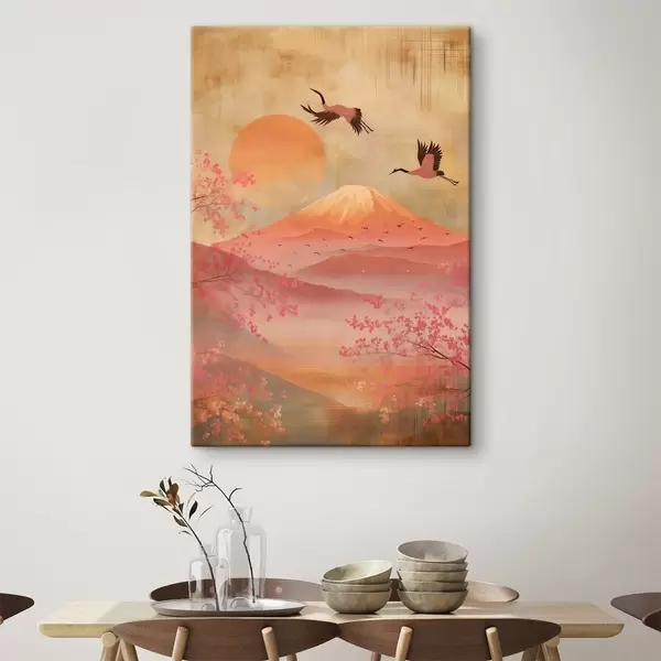 Tableau Grues contre le soleil et les montagnes : illustration dans un style artistique numérique s47992