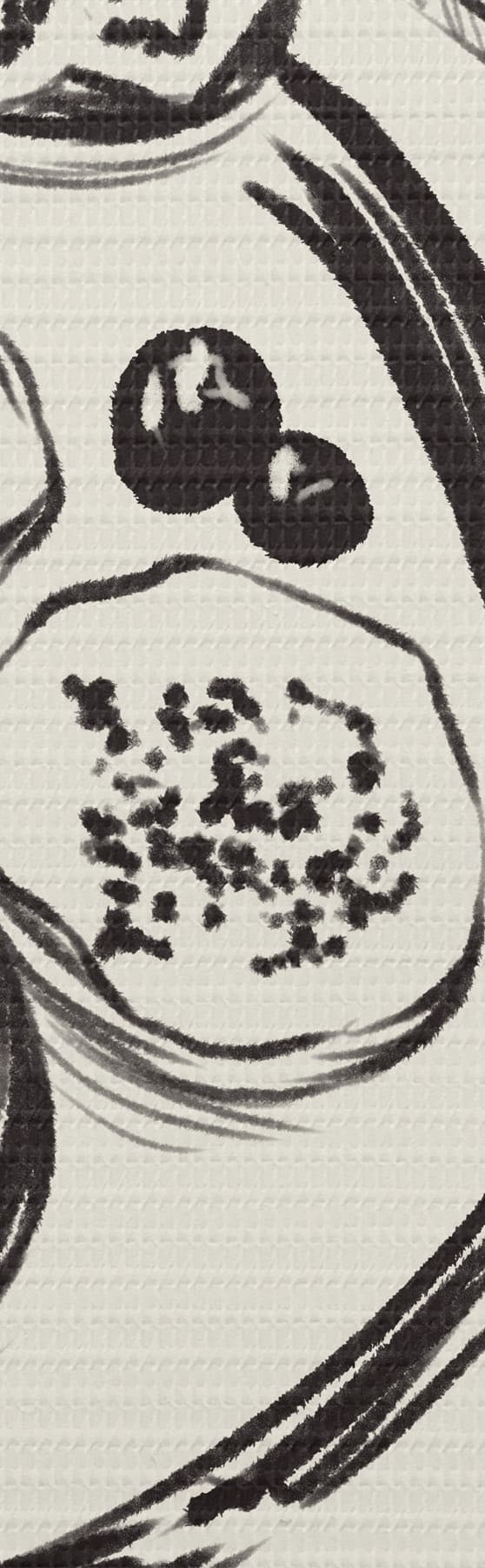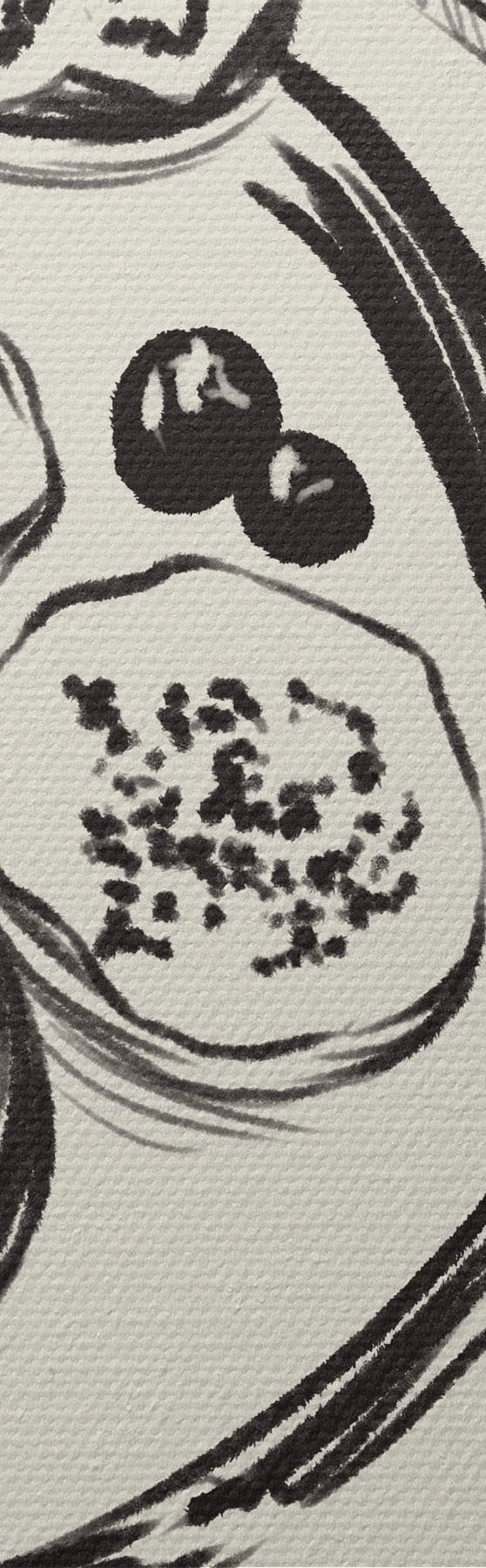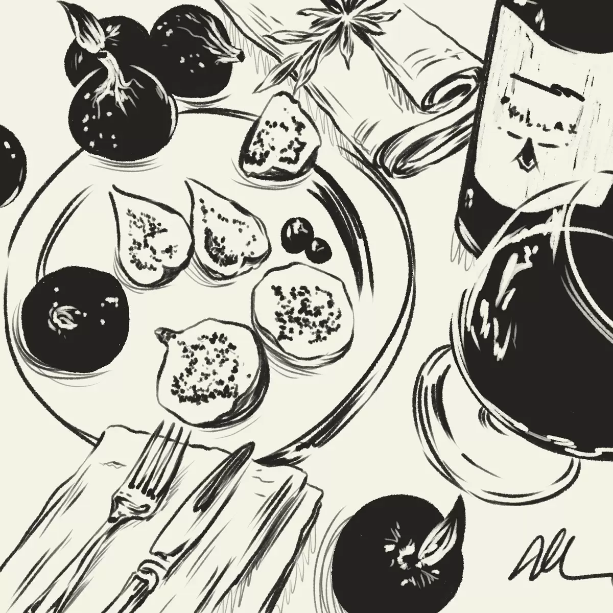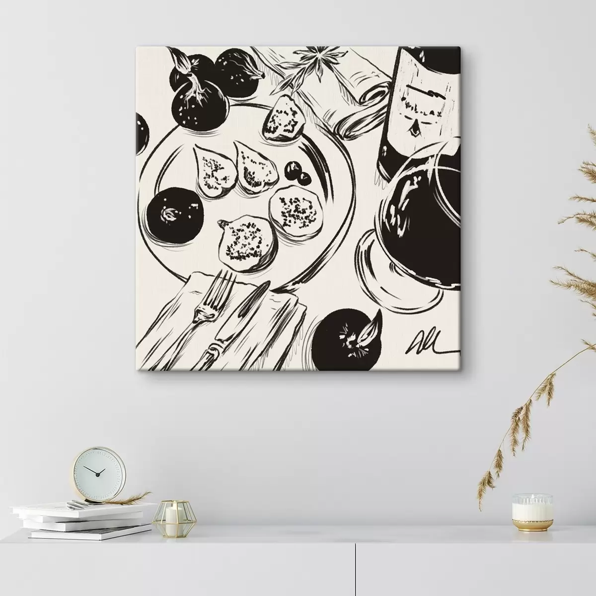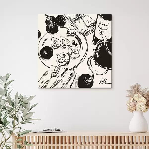 Tableau Esquisse en noir et blanc d'une table avec des fruits et un verre s48030