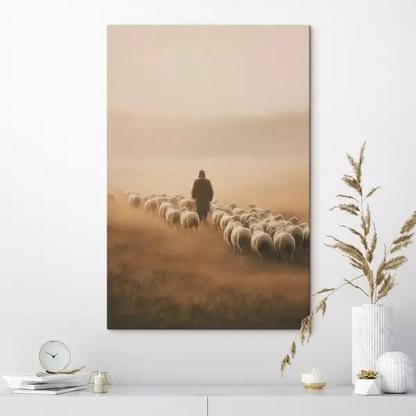 Tableau berger marchant avec son troupeau de moutons dans un champ s48077