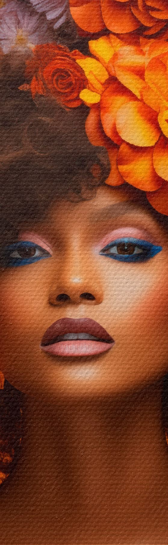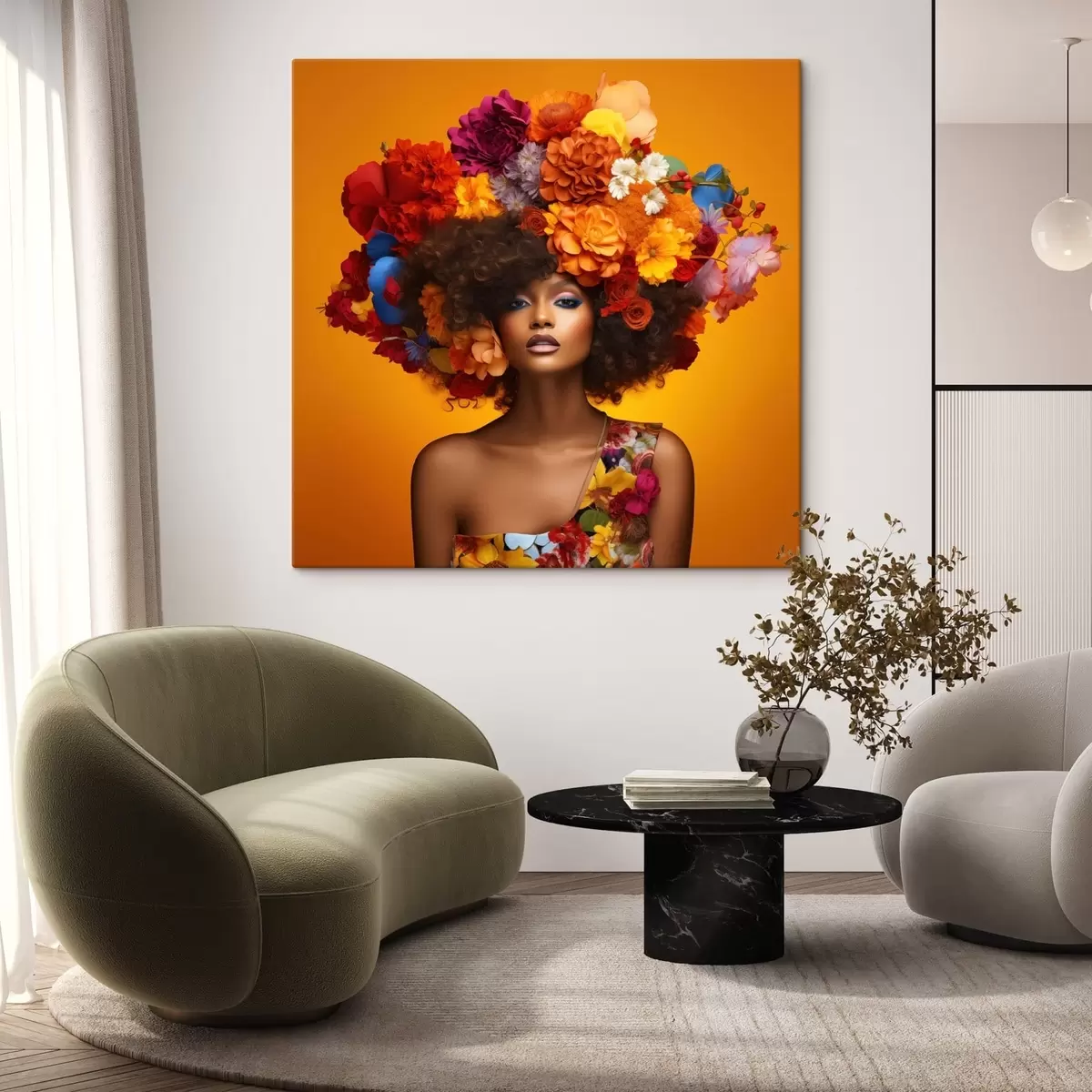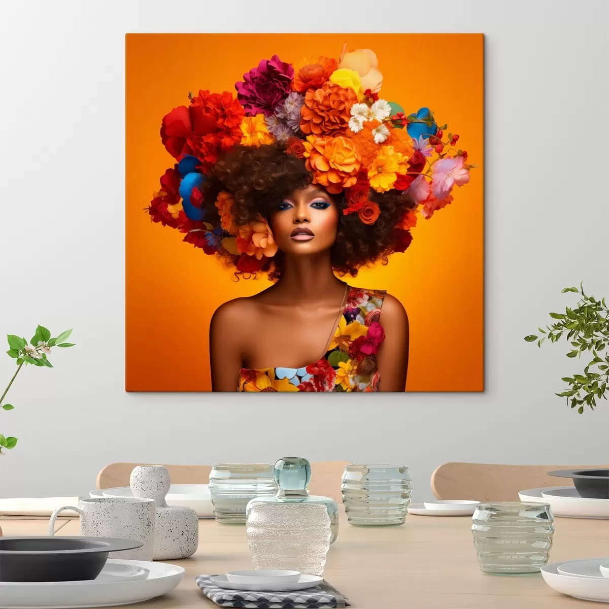 Tableau Femme avec une coiffe fleurie sur fond orange s48102