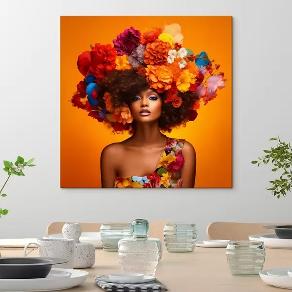 Tableau Femme avec une coiffe fleurie sur fond orange Nr s48102