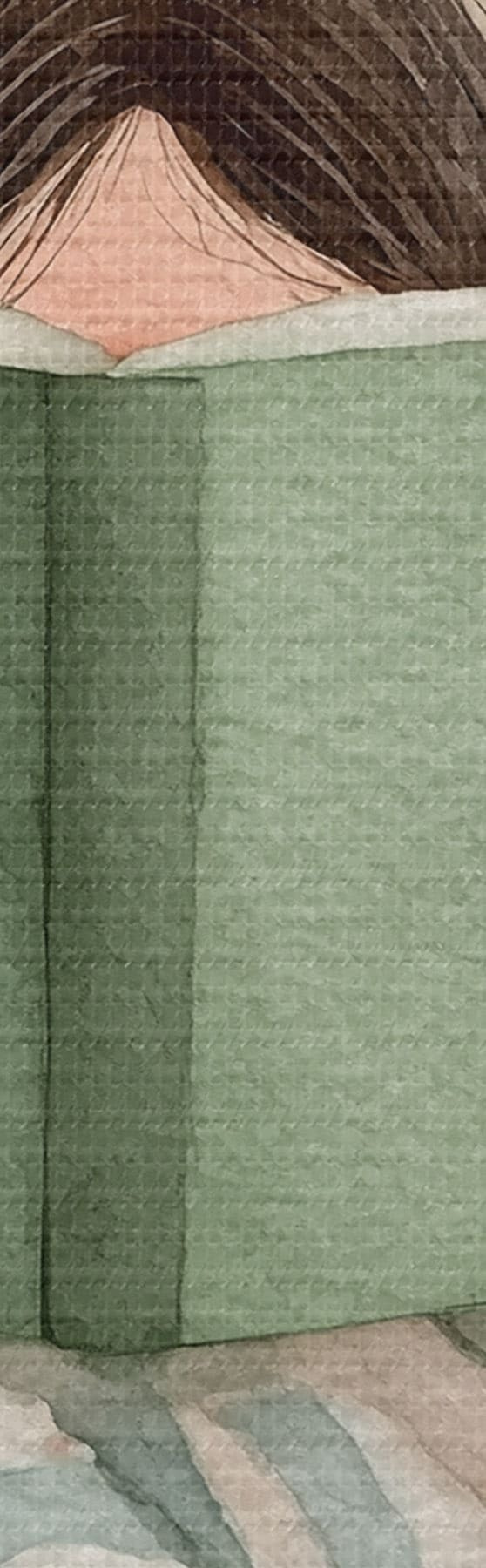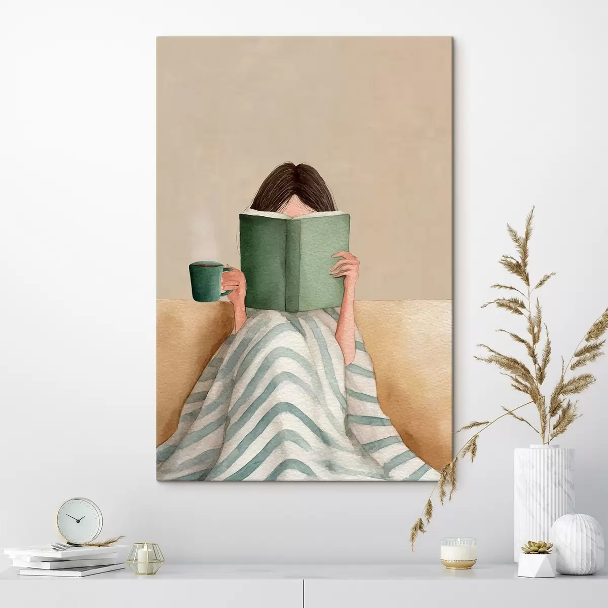 Tableau Illustration à l'aquarelle représentant une femme assise sur un canapé en train de lire un livre. Nr s48114