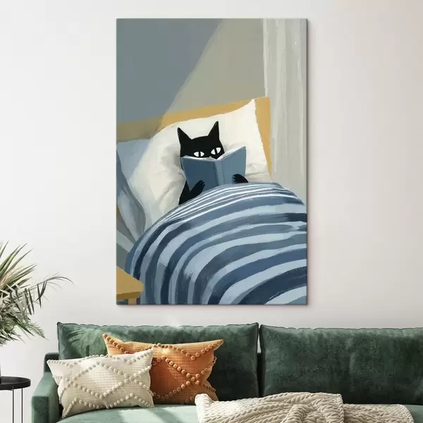 Tableau Illustration minimaliste d'un chat noir lisant un livre dans son lit. s48117