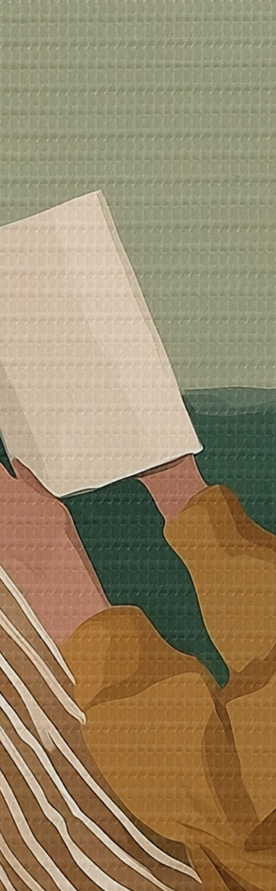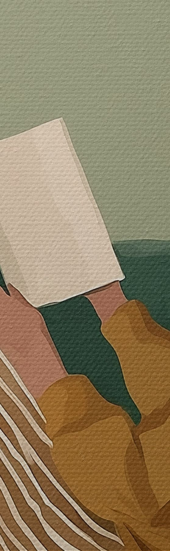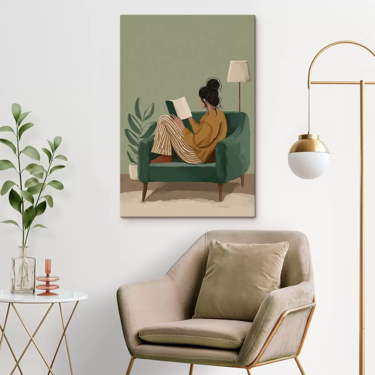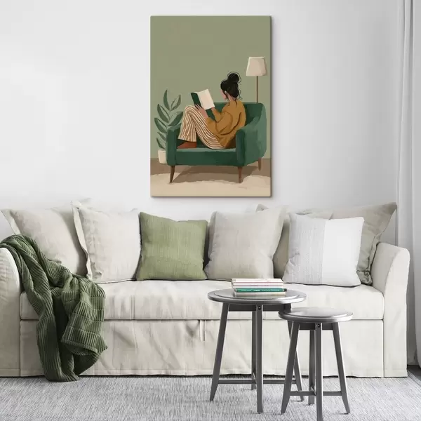 Tableau Illustration minimaliste et chaleureuse d'une femme assise dans un fauteuil en train de lire. Nr s48118