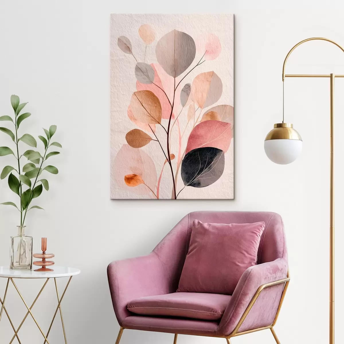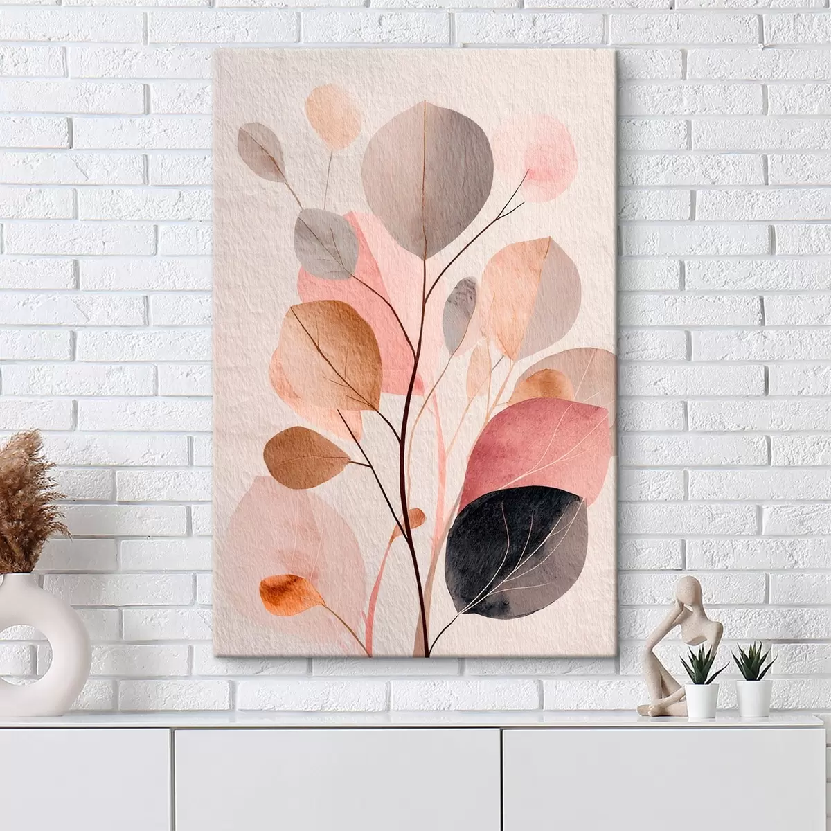 Tableau Branche abstraite aux feuilles arrondies, dans des tons chauds de beige et de corail s48187