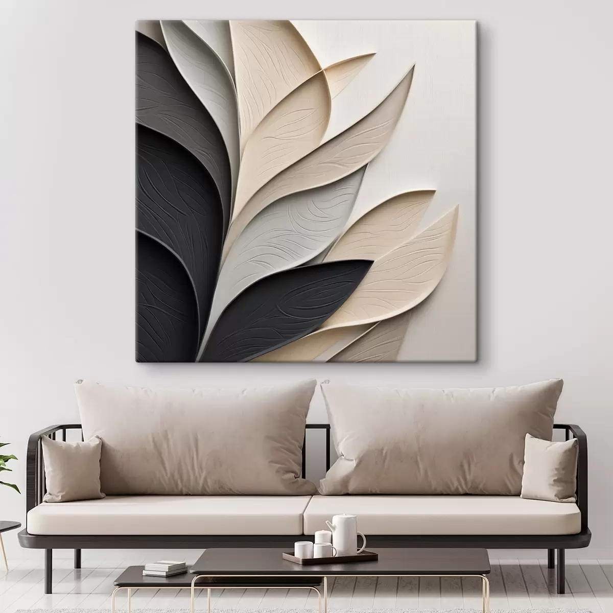 Tableau Composition abstraite de feuilles superposées, de formes courbes en noir, blanc et beige, œuvre d'art texturée s48382