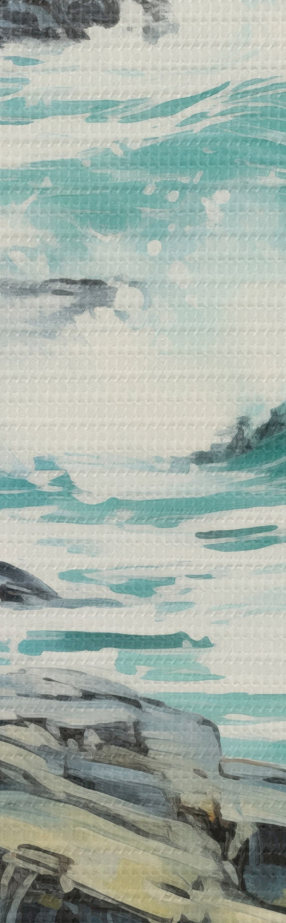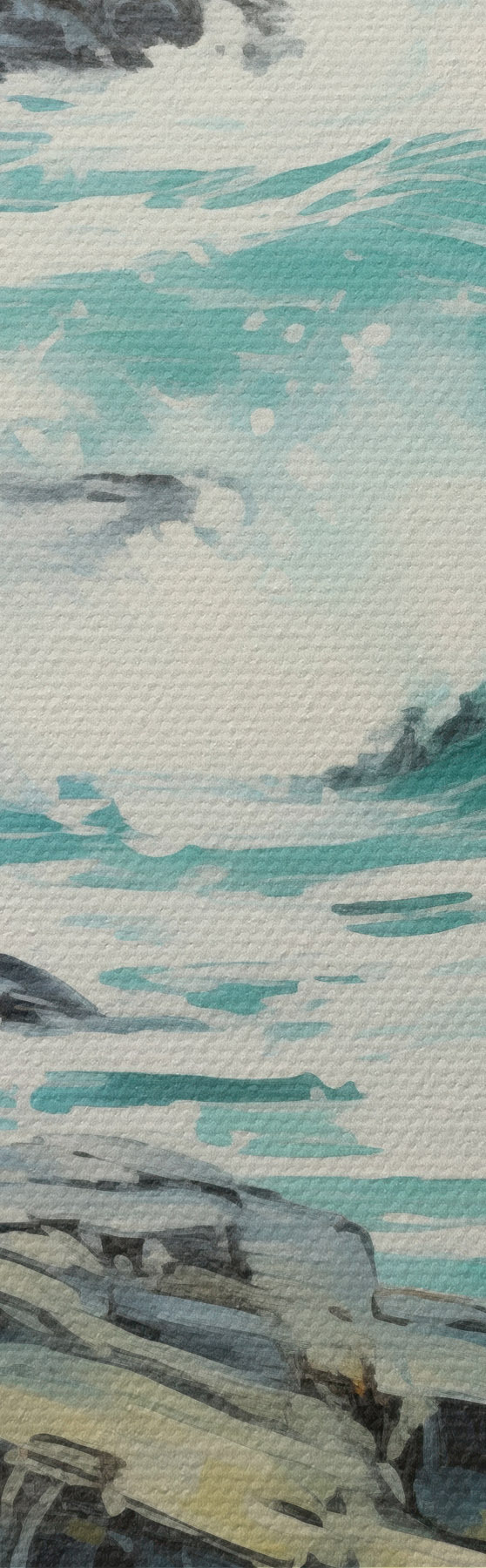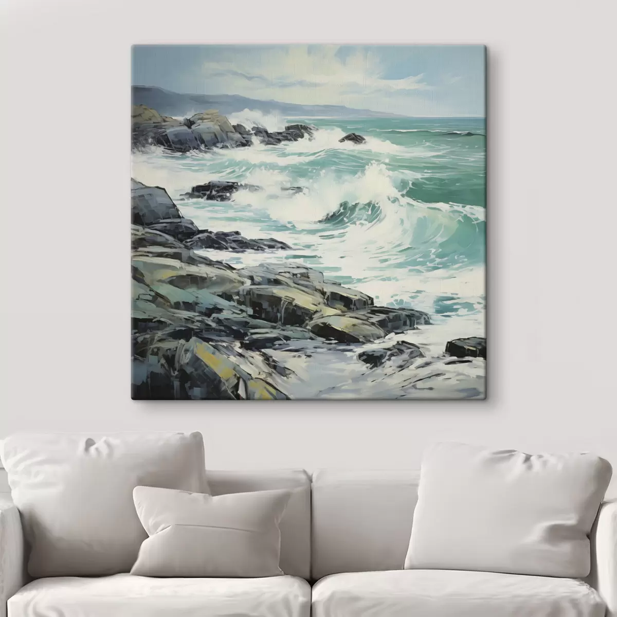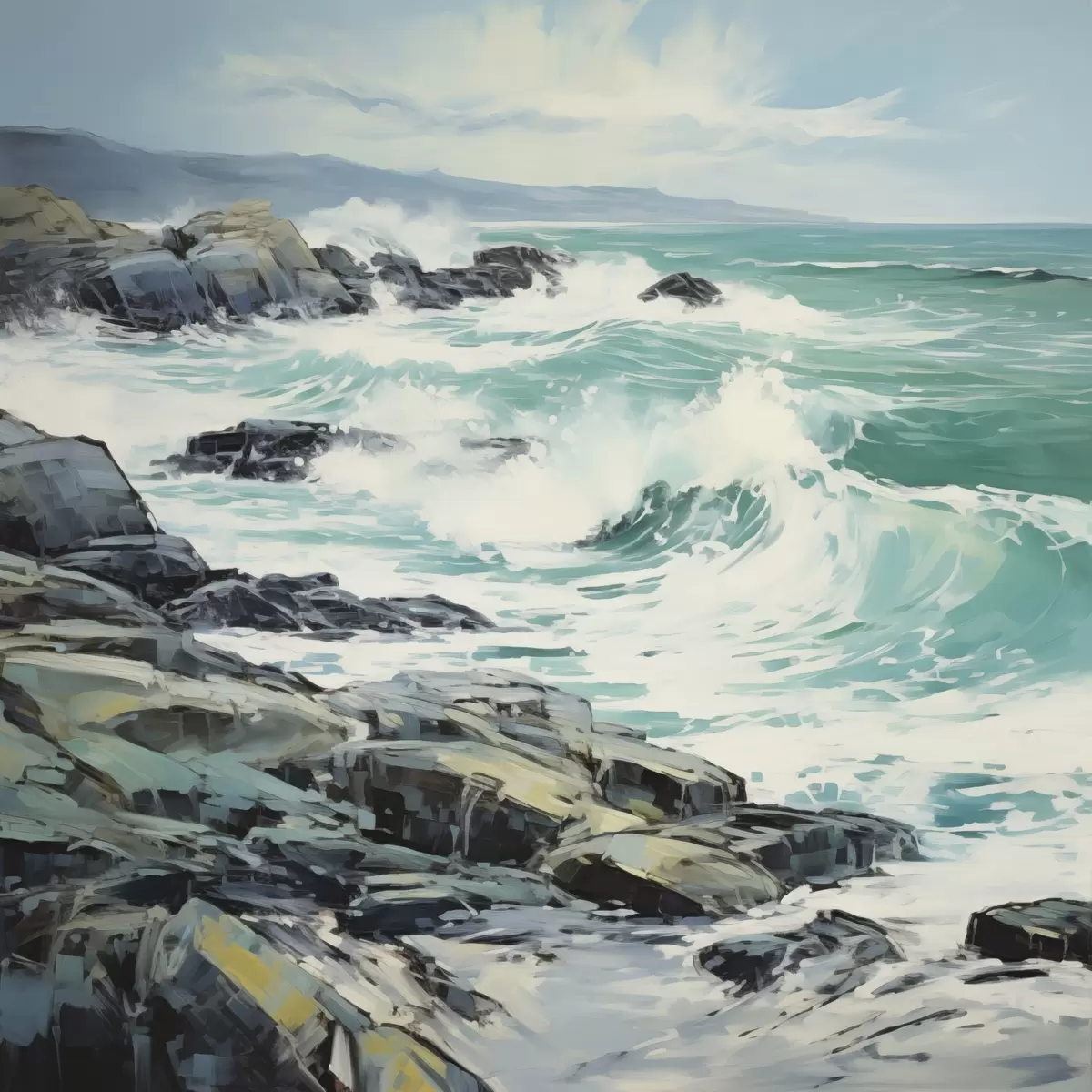 Tableau Un paysage de côte rocheuse avec des vagues sous un ciel nuageux, style peinture s48388