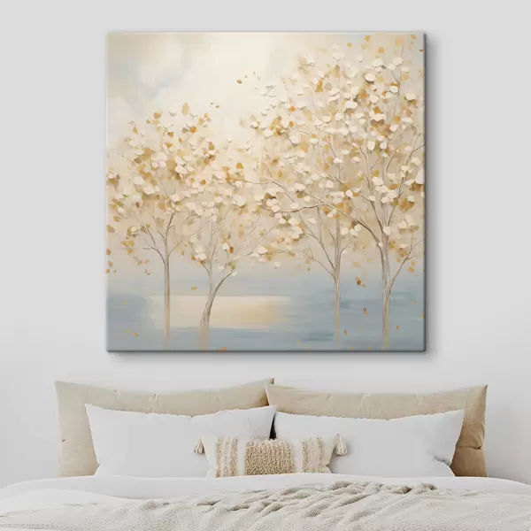 Tableau Une peinture au style texturé représentant des arbres aux feuilles blanches et jaunes sur un fond bleu clair Nr s48392