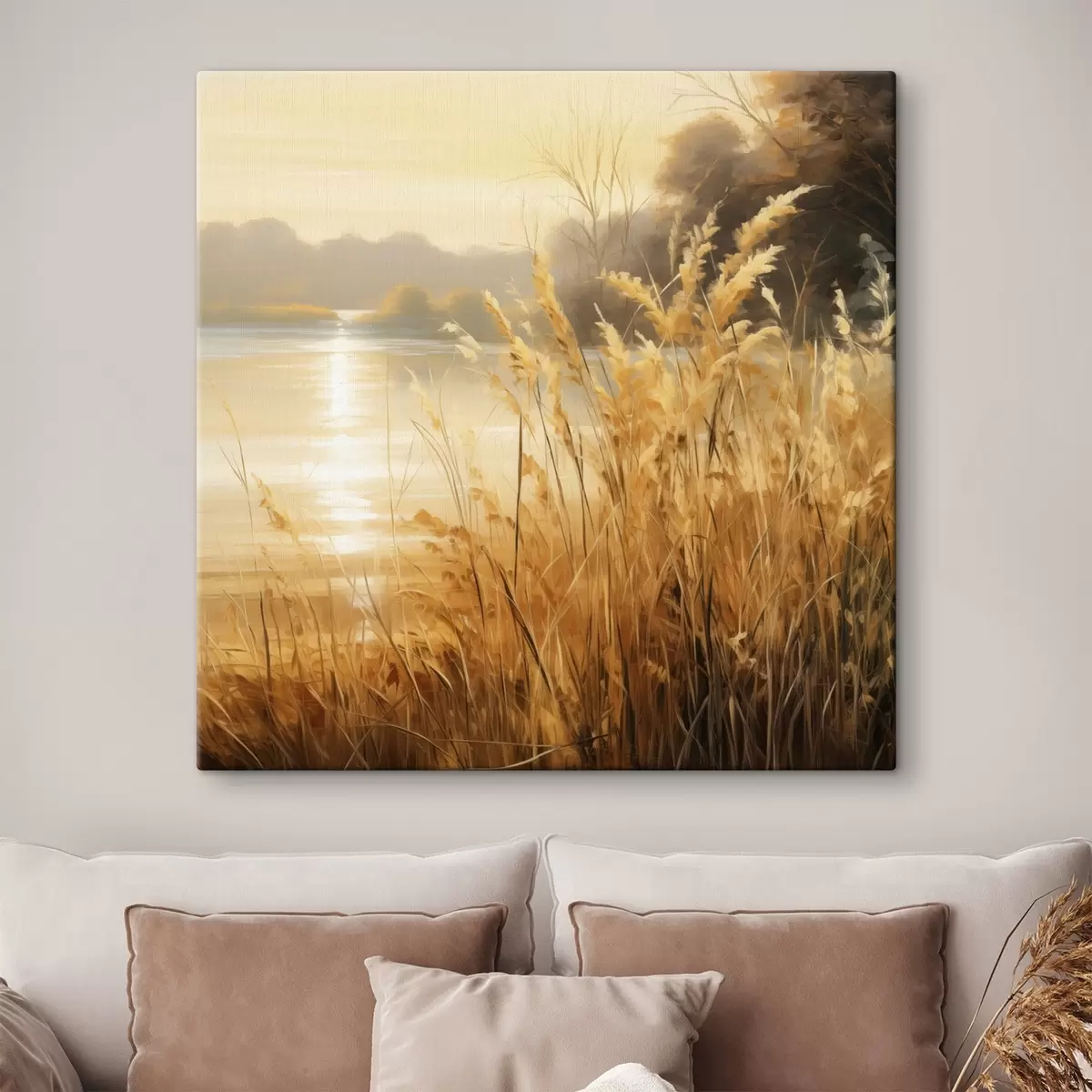Tableau Au premier plan, de hautes herbes aux épillets secs ; à l'arrière-plan, un lac et des arbres Nr s48393
