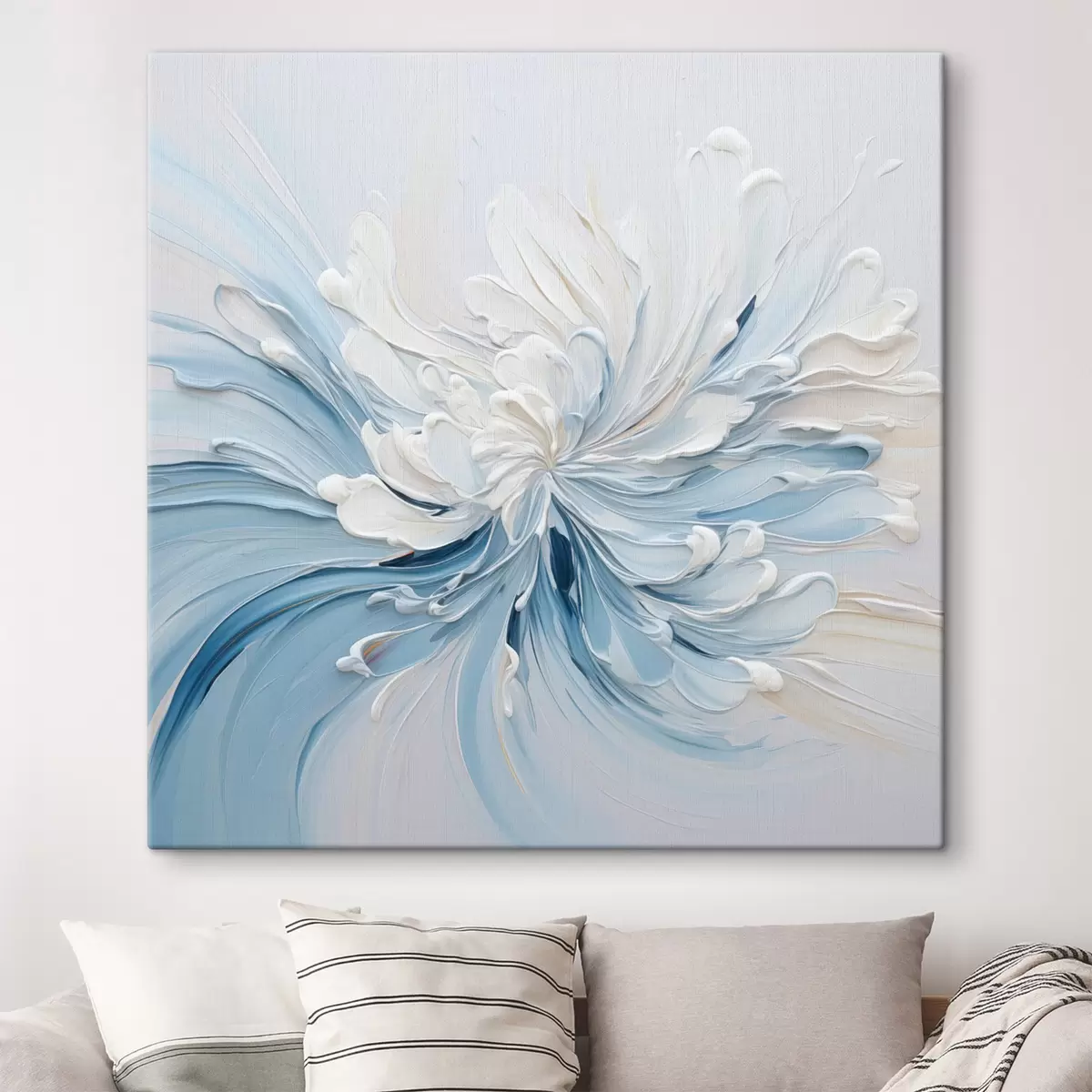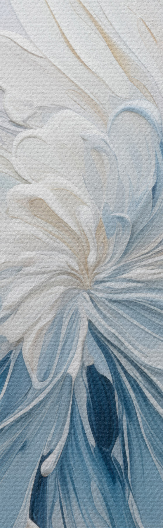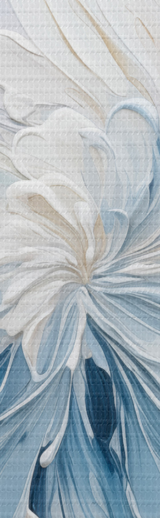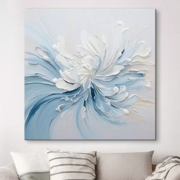 Tableau Un motif floral abstrait blanc et bleu clair, composé de pétales texturés et de lignes sinueuses s48396