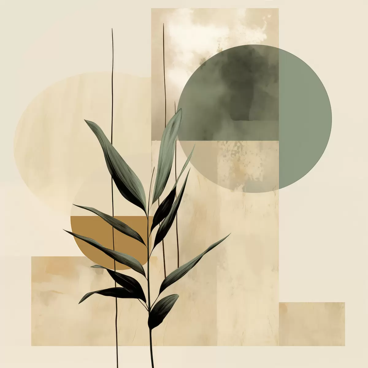 Tableau Une plante vert foncé aux formes géométriques abstraites et aux textures aquarellées dans les tons beiges et verts Nr s48409