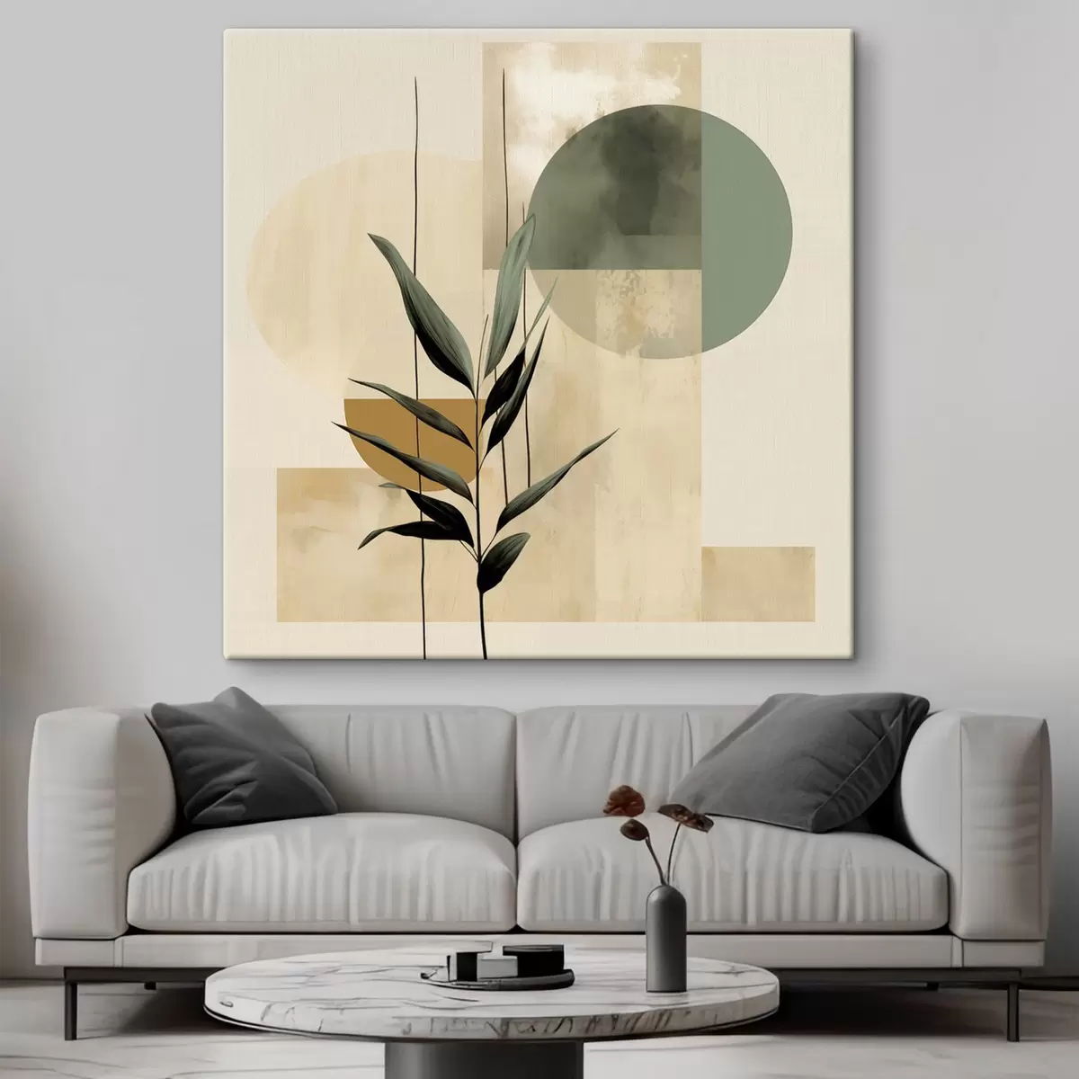 Tableau Une plante vert foncé aux formes géométriques abstraites et aux textures aquarellées dans les tons beiges et verts s48409