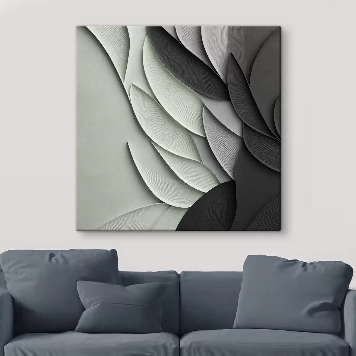 Tableau Feuilles stylisées et abstraites dans des tons de gris, de blanc et de vert discret s48412