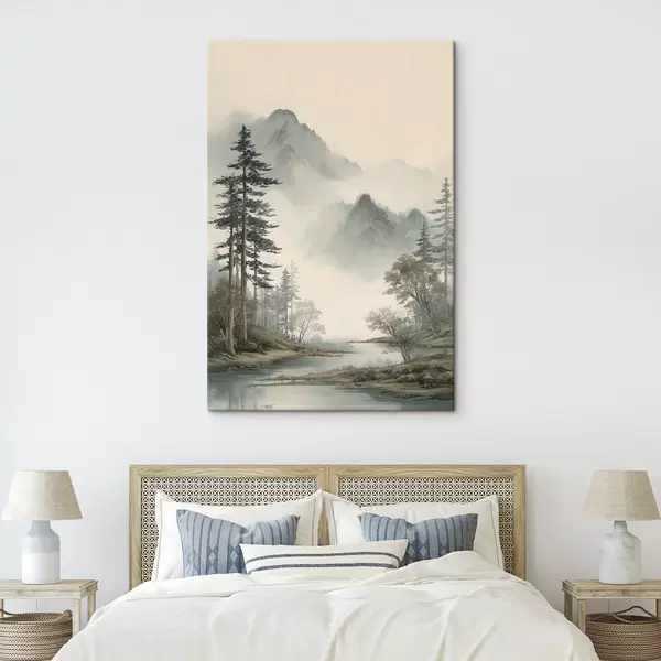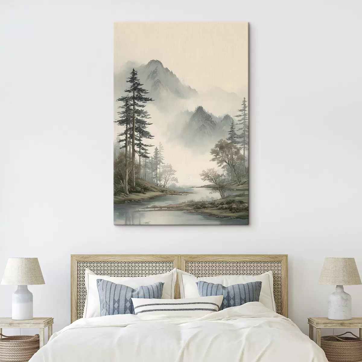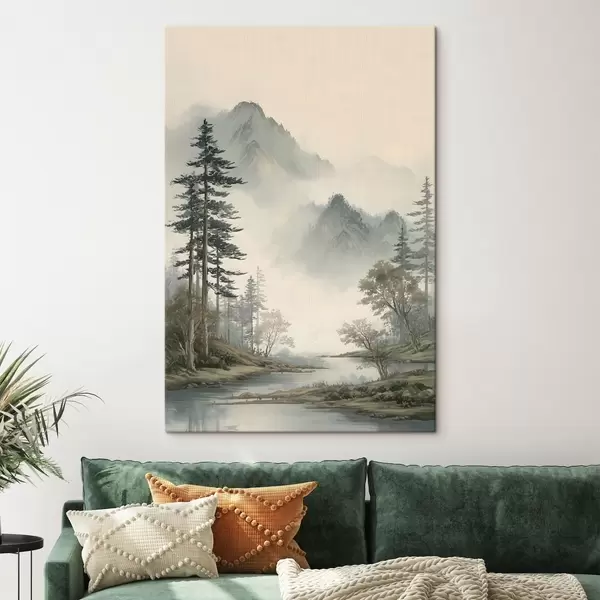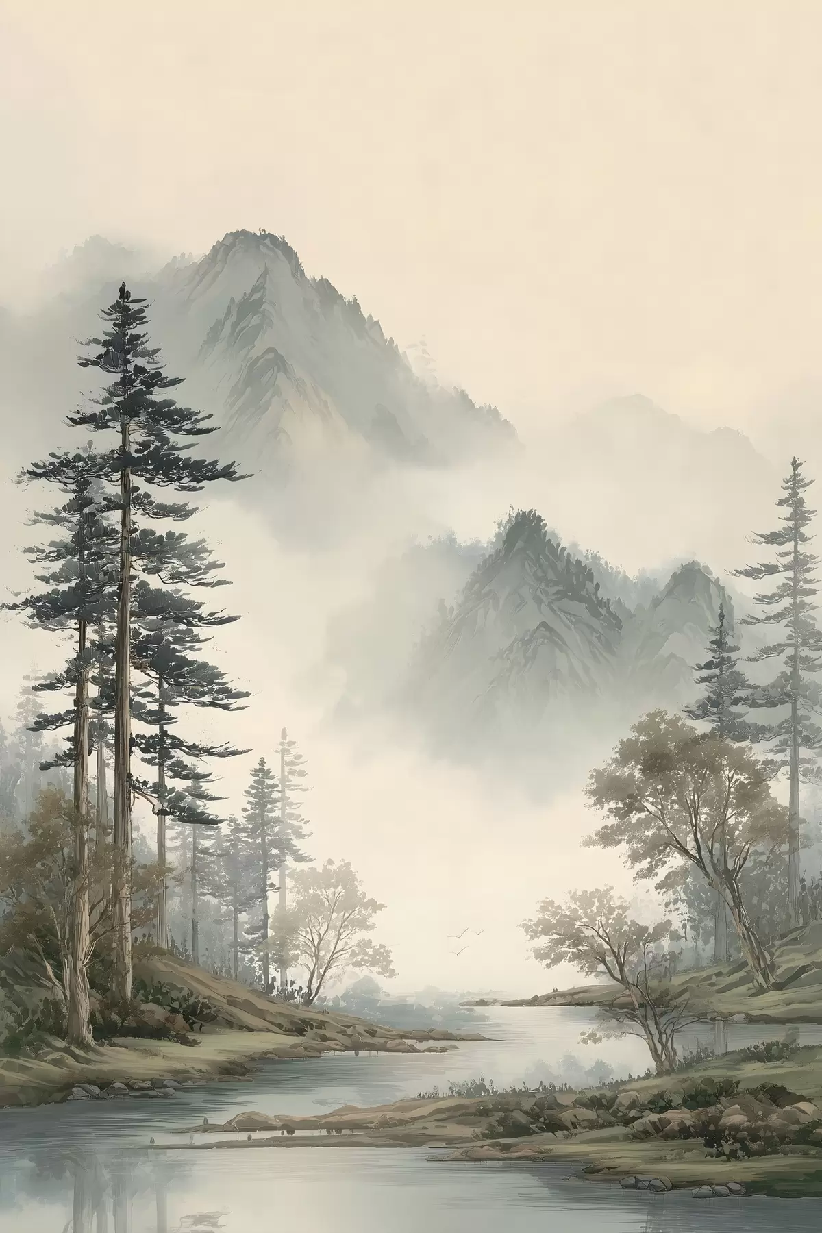 Tableau un paysage de montagne avec des pins et une rivière s48531