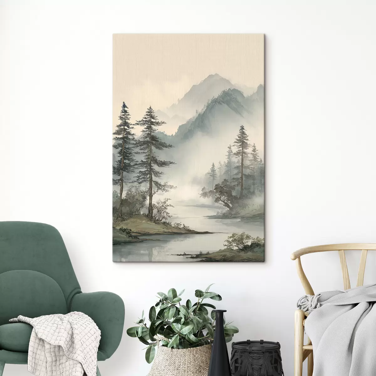 Tableau un paysage de montagne avec des pins et une rivière s48532