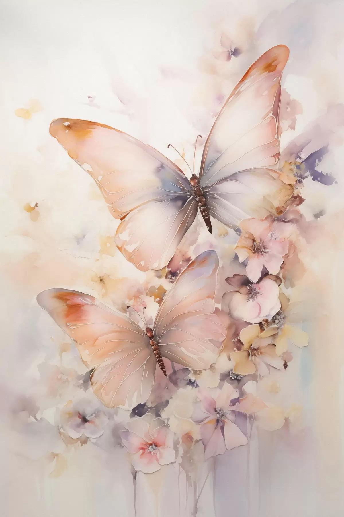 Tableau De délicates fleurs accompagnées de papillons, dans des tons pastel Nr s48563