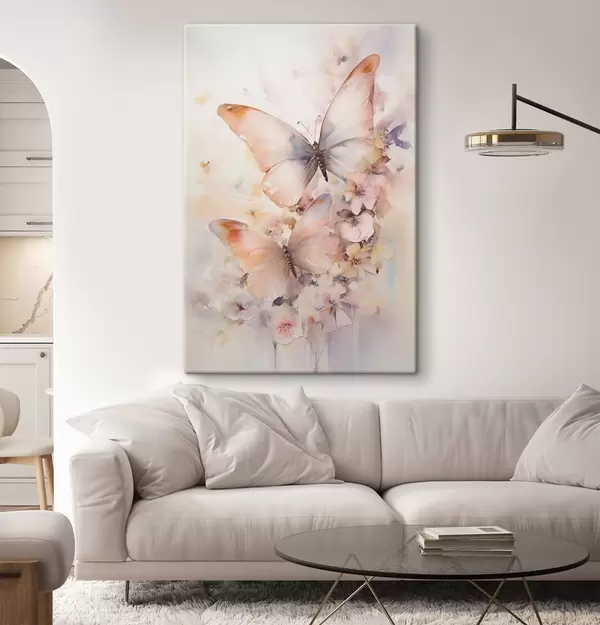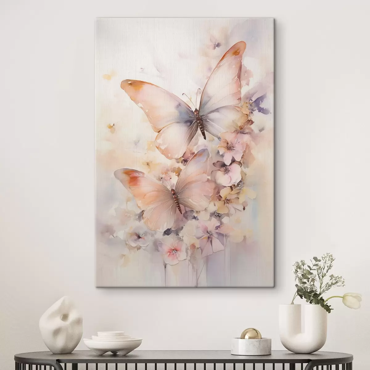 Tableau De délicates fleurs accompagnées de papillons, dans des tons pastel s48563