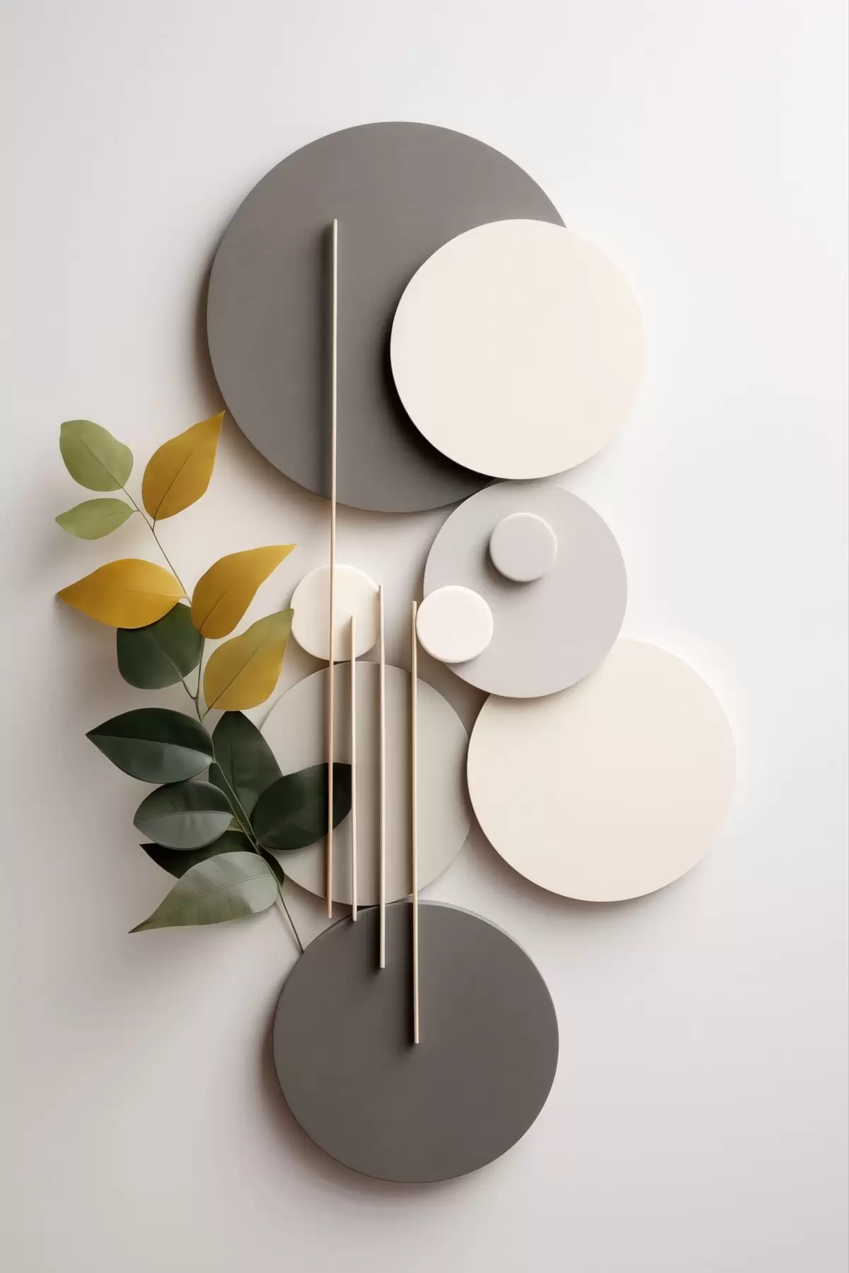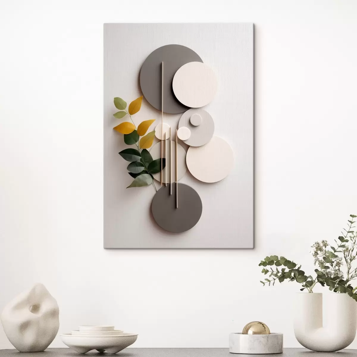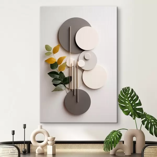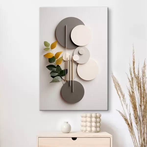 Tableau Cercles géométriques accompagnés d'une branche feuillue verte s48598