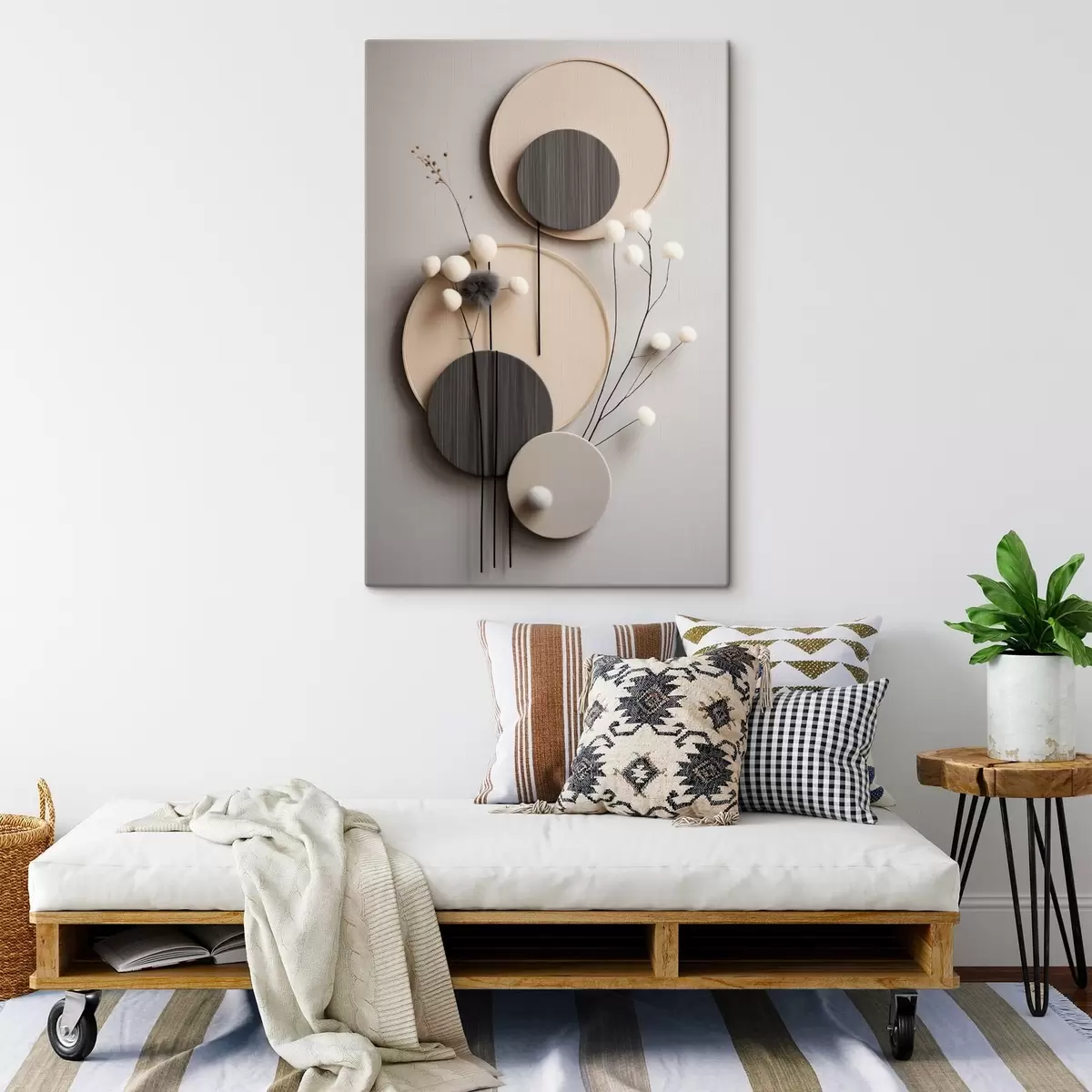 Tableau Panneaux ronds ornés de brindilles sèches et de boules moelleuses s48601