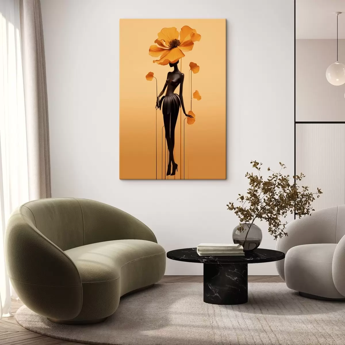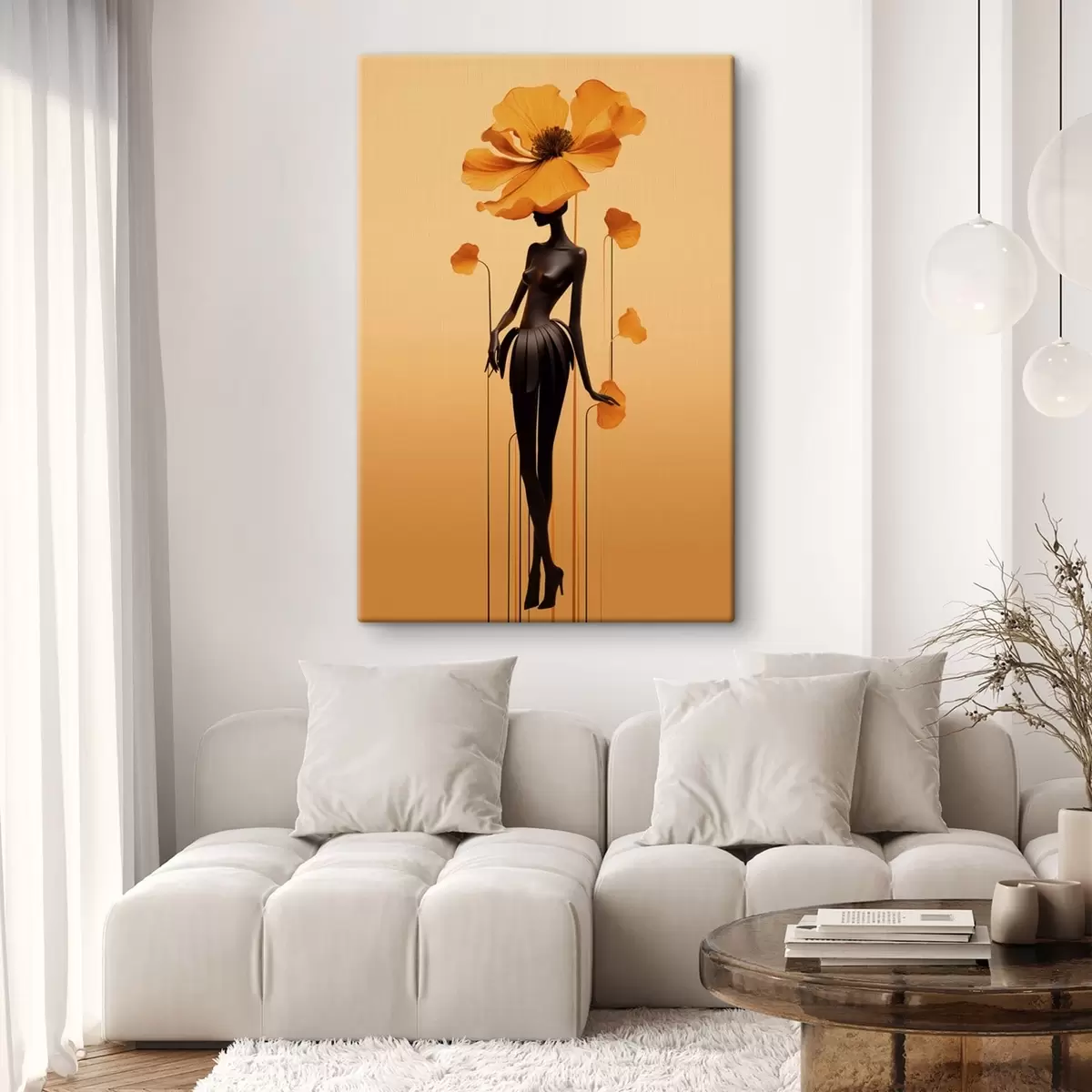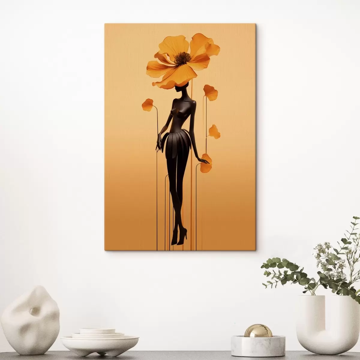 Tableau Une silhouette élégante ornée de fleurs sur un fond aux tons dégradés chauds s48619