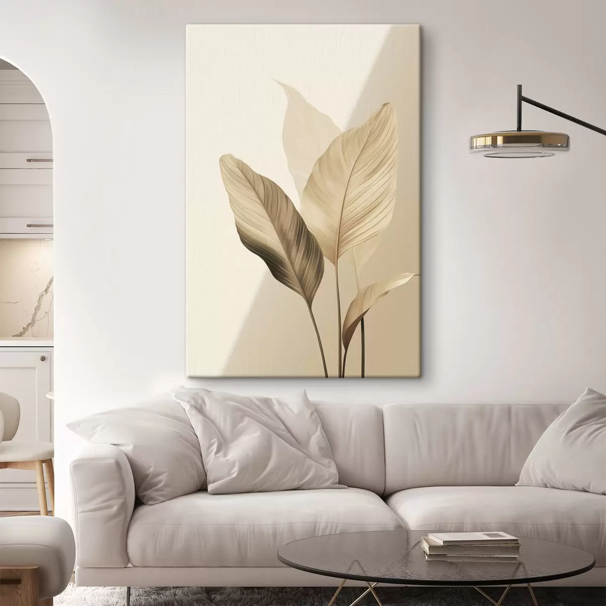 Tableau Grandes feuilles tropicales dans des tons de beige et de marron, sur fond clair s48726